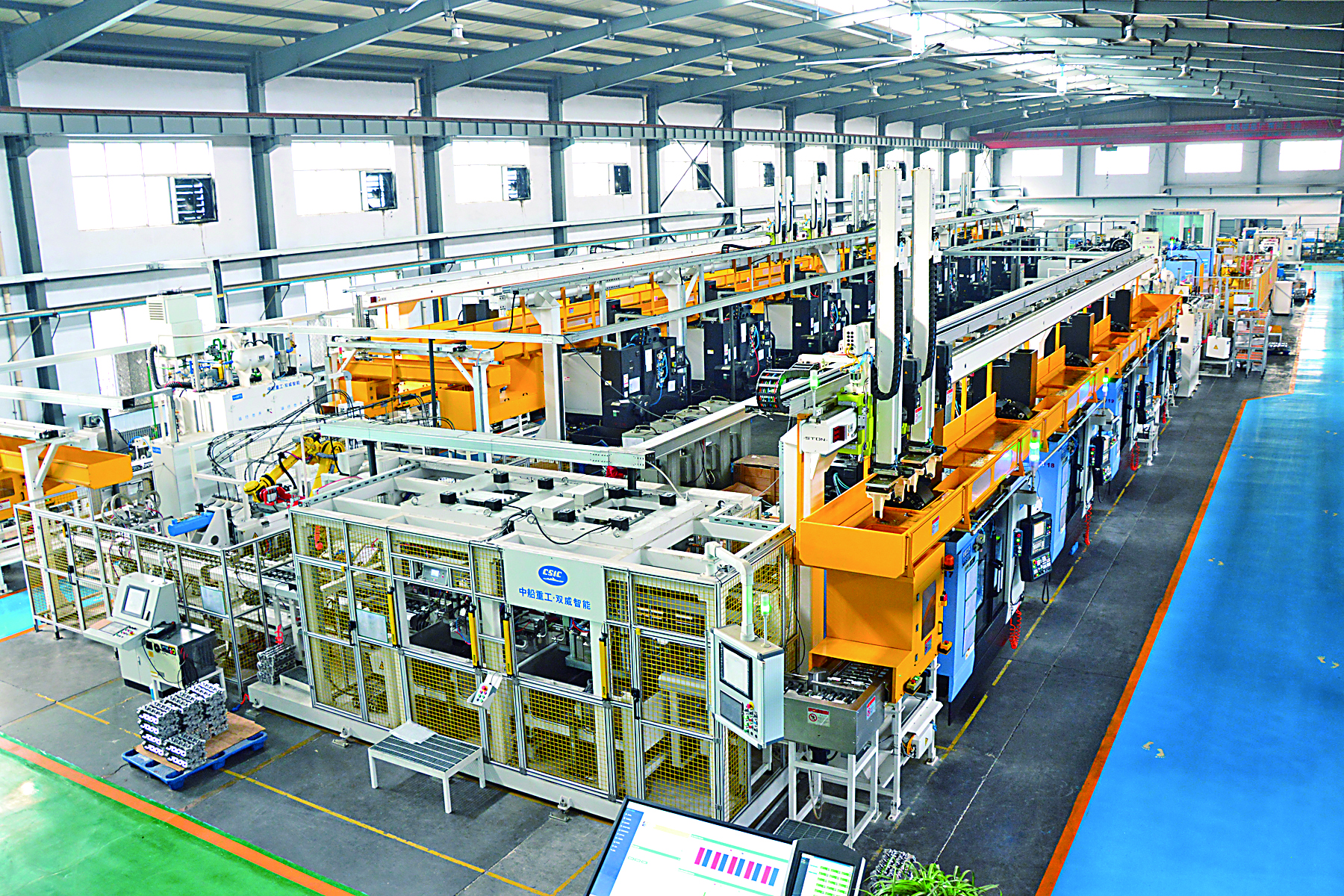 特别值得一提的是,机器人的使用在大幅提高生产效率和产品质量的同时,有效节约了人力成本。这些智能设备的使用让生产线的流程转换变得非常流畅,最大限度地避免了人工操作可能出现的失误。“整条生产线包括检测人员在内,只需要5个人就可以完成工作。另外,在生产线前端还配有一块电子屏幕,整个生产线设备的运行状态、工艺参数、人员情况等都可实现实时监控和预警。”阳煤千军机加车间负责人告诉记者,“与此同时,它还可以为生产线提供包括制造数据管理、质量管理、人员考勤方面的支持,通过这种透明化的生产监控,我们可以对生产过程中的异常提前预防和快速反应,从而保证整条生产线的平稳运行。”