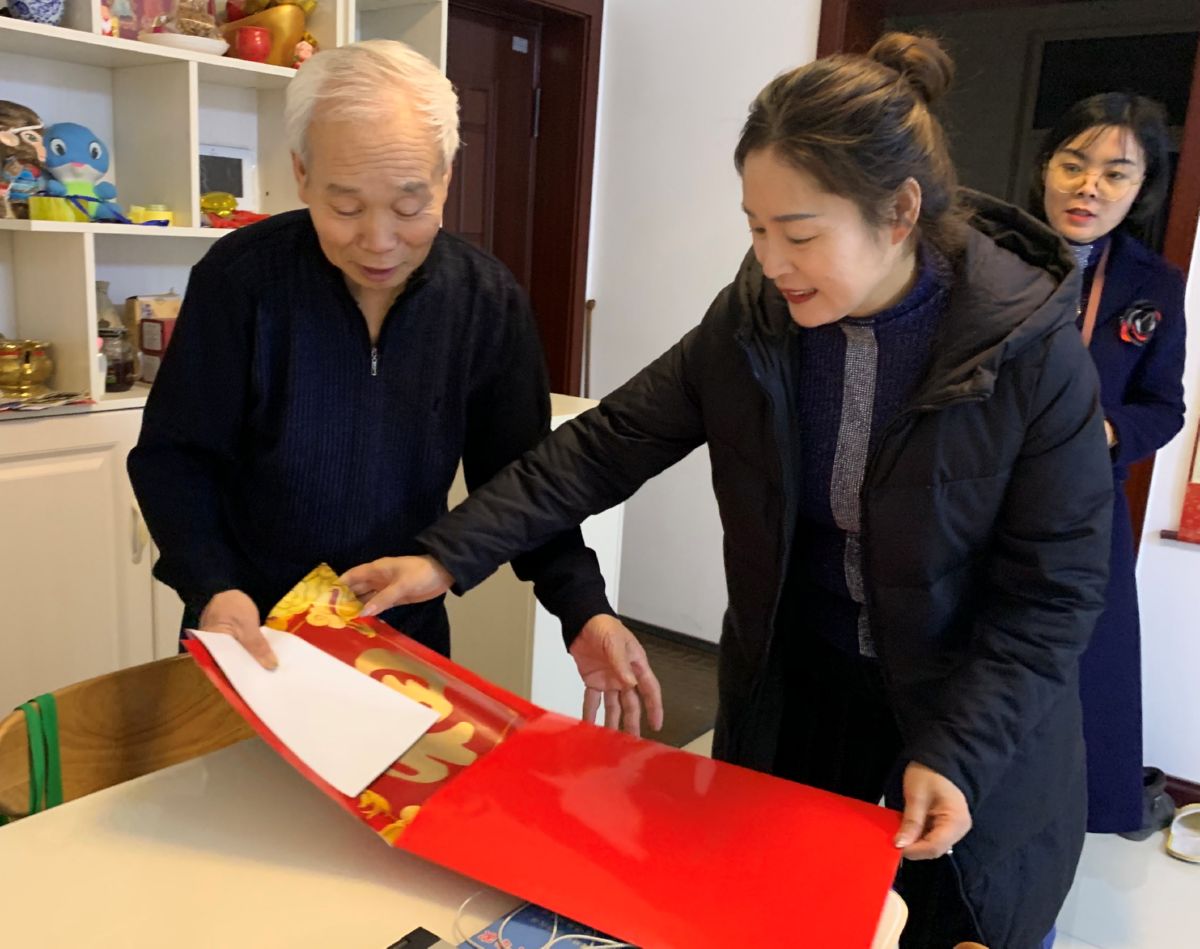 ▲物业公司工作人员为老人送新春礼包 廖旌汝 摄