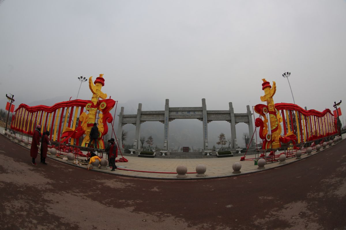 ▲1月8日下午,永济市舜帝山森林公园,工人们正在安装大型迎春彩灯造型。