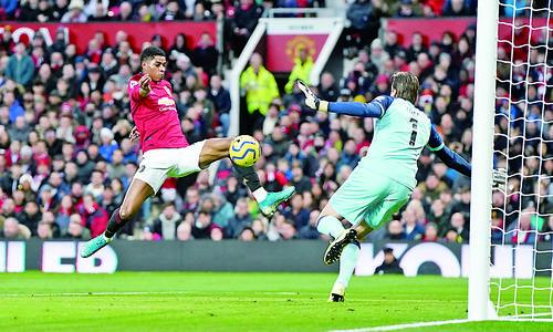 ▲1月11日,曼彻斯特联队球员拉什福德(左)射门得分。 当日,在2019~2020赛季英格兰足球超级联赛第22轮比赛中,曼彻斯特联队主场以4比0战胜诺维奇队。新华社发