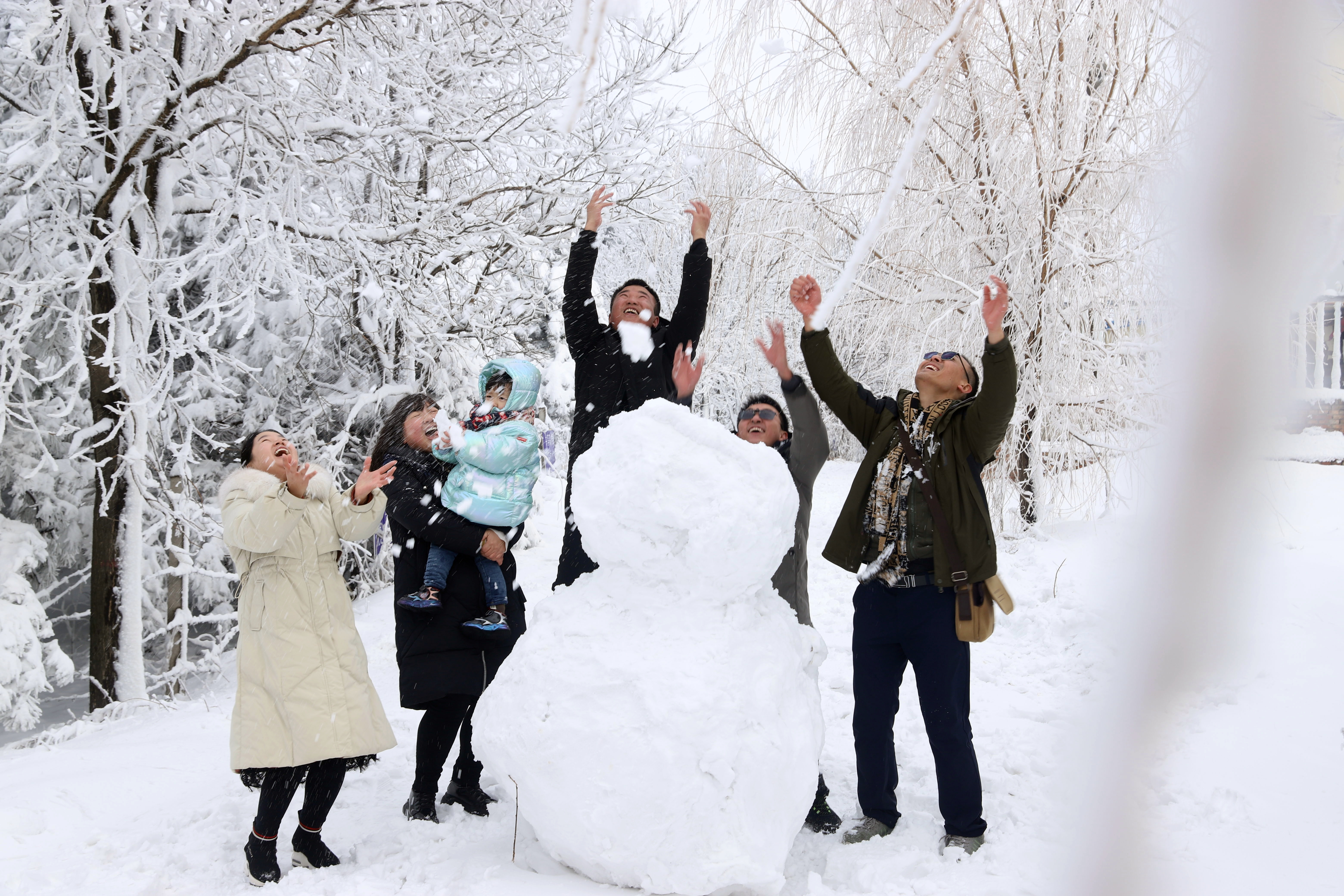 近日,游客在平陆县张店镇风口赏雪景、堆雪人。