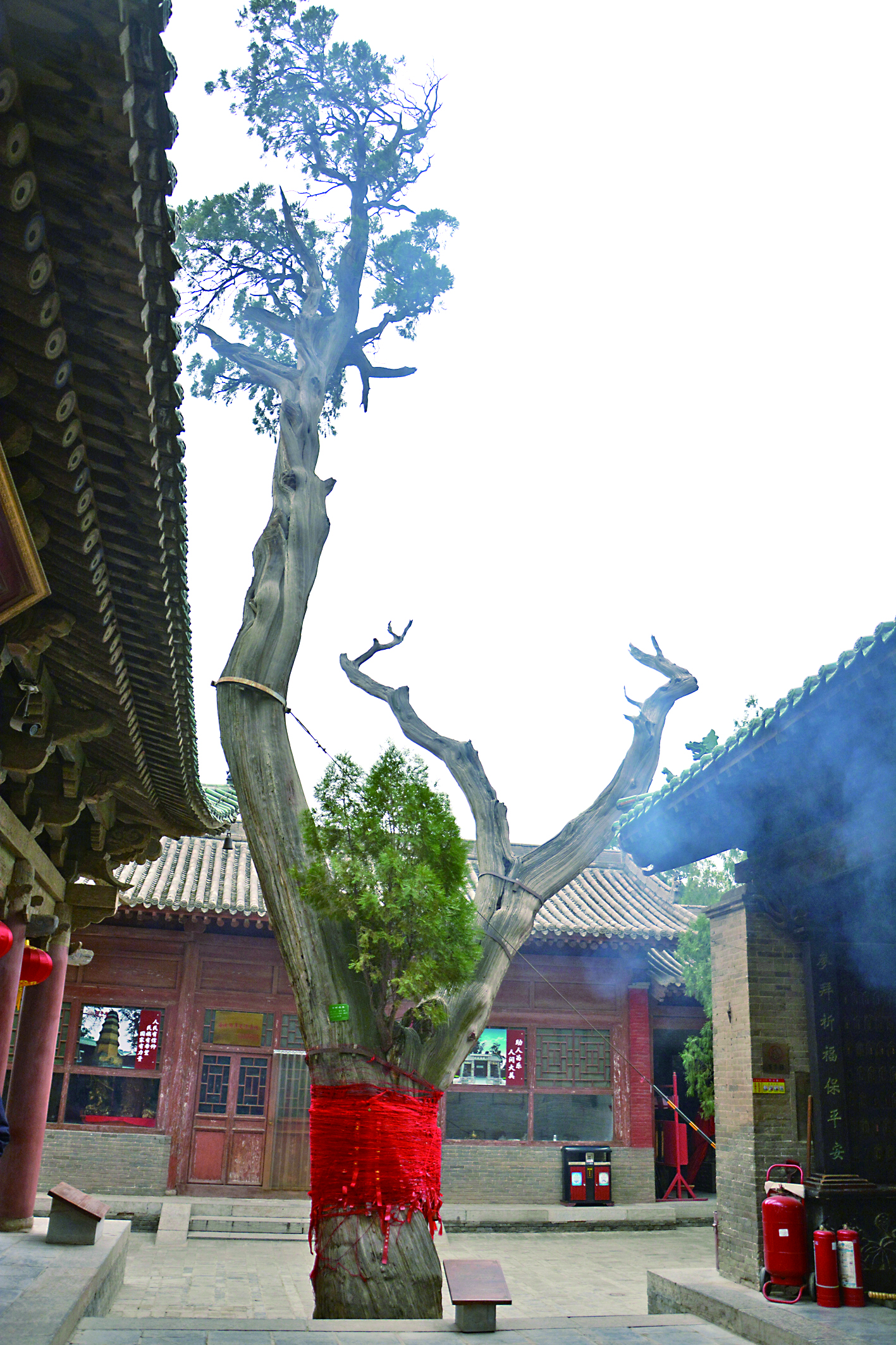 ▲盐湖区常平家庙凤柏 在常平家庙娘娘殿西侧,有一全裂式千年巨柏,很像一只展翅腾飞的大鸟,其头、翅、尾样样俱全,人称“凤柏”。 这里还有个神奇的故事——就在这棵柏树刚刚成材时,当地有位老财主要用其做口柏木棺材。第二天,他正准备开锯取树,忽然狂风大作,一个惊雷将树劈为两半。老财主见状惊恐万分,便急忙敬香向关帝乞求恕罪,并用铁箍将裂树箍了起来,如今尚可看到那铁箍已深陷于树中。后来,此树又焕发生机,长成如今这飞鸟似的造型。