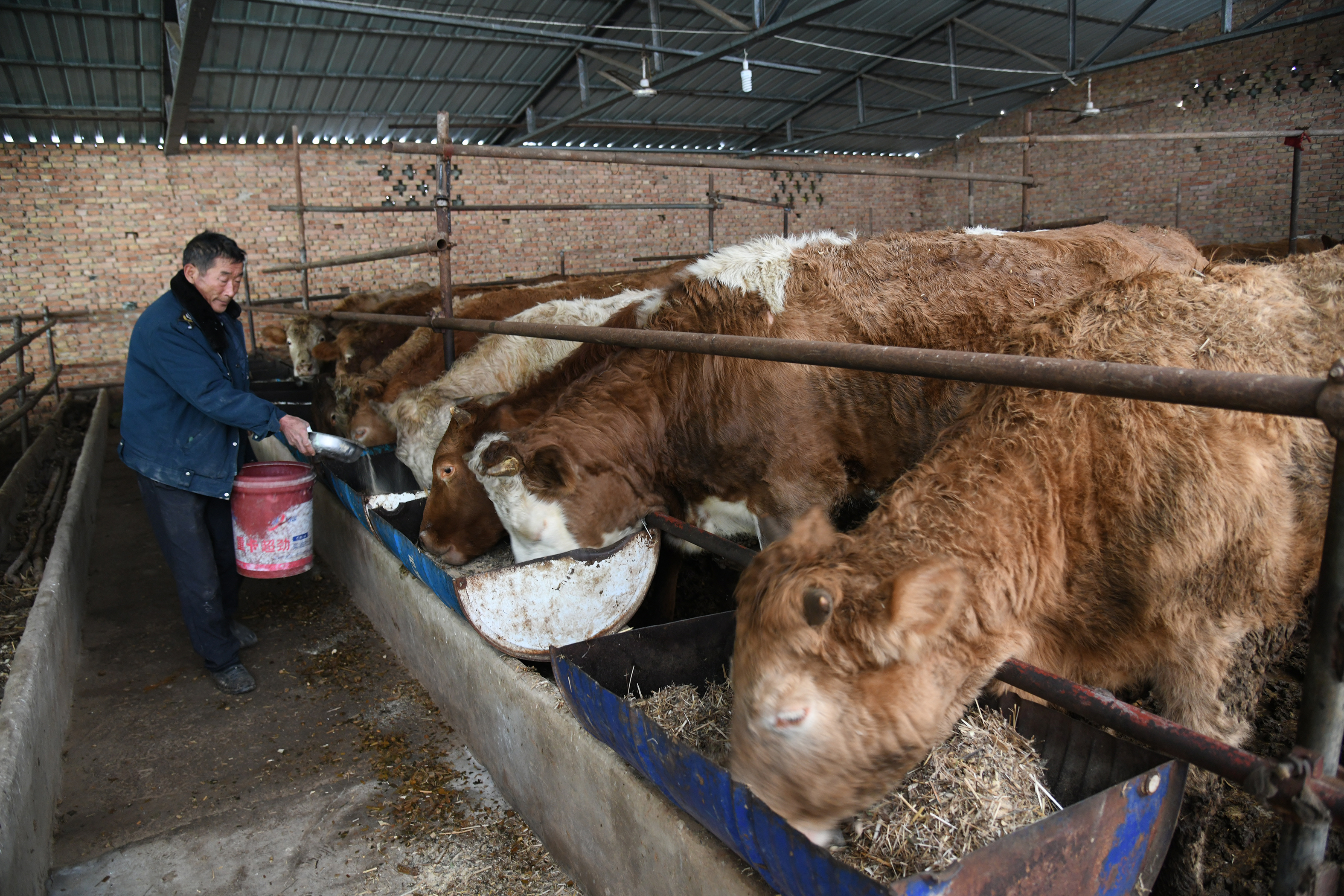 1月13日,闻喜县裴社乡小王沟村映山红种养殖专业合作社社员在给牛添料。