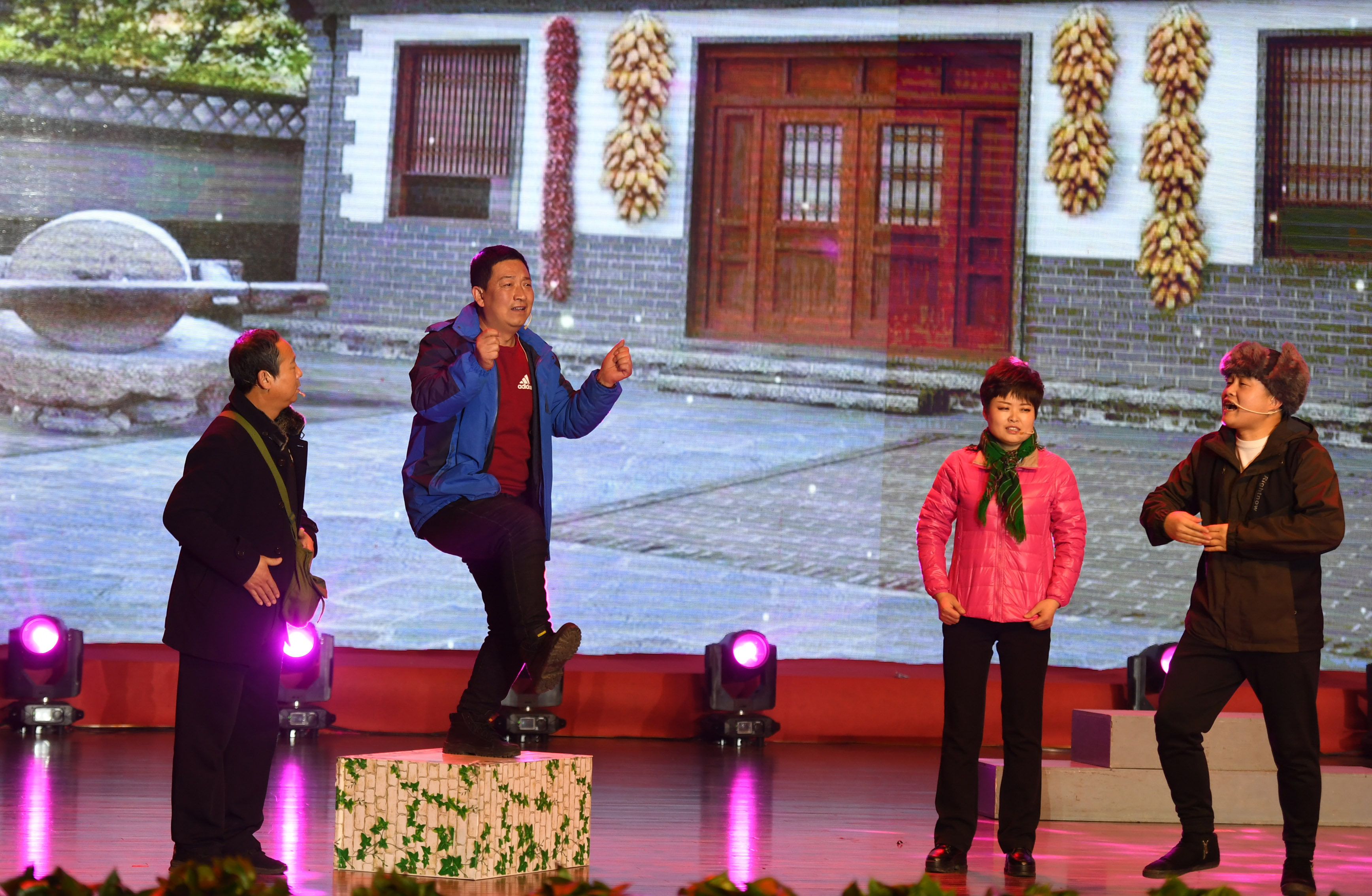 1月16日晚,稷山县群众在表演小品《在灿烂阳光下》。当晚,稷山县百姓春晚激情上演,当地群众登台献艺,自编自演了村歌、舞蹈、小品、快板、情景剧等丰富多彩的文艺节目,喜迎鼠年新春。 特约摄影 栗卢建 摄