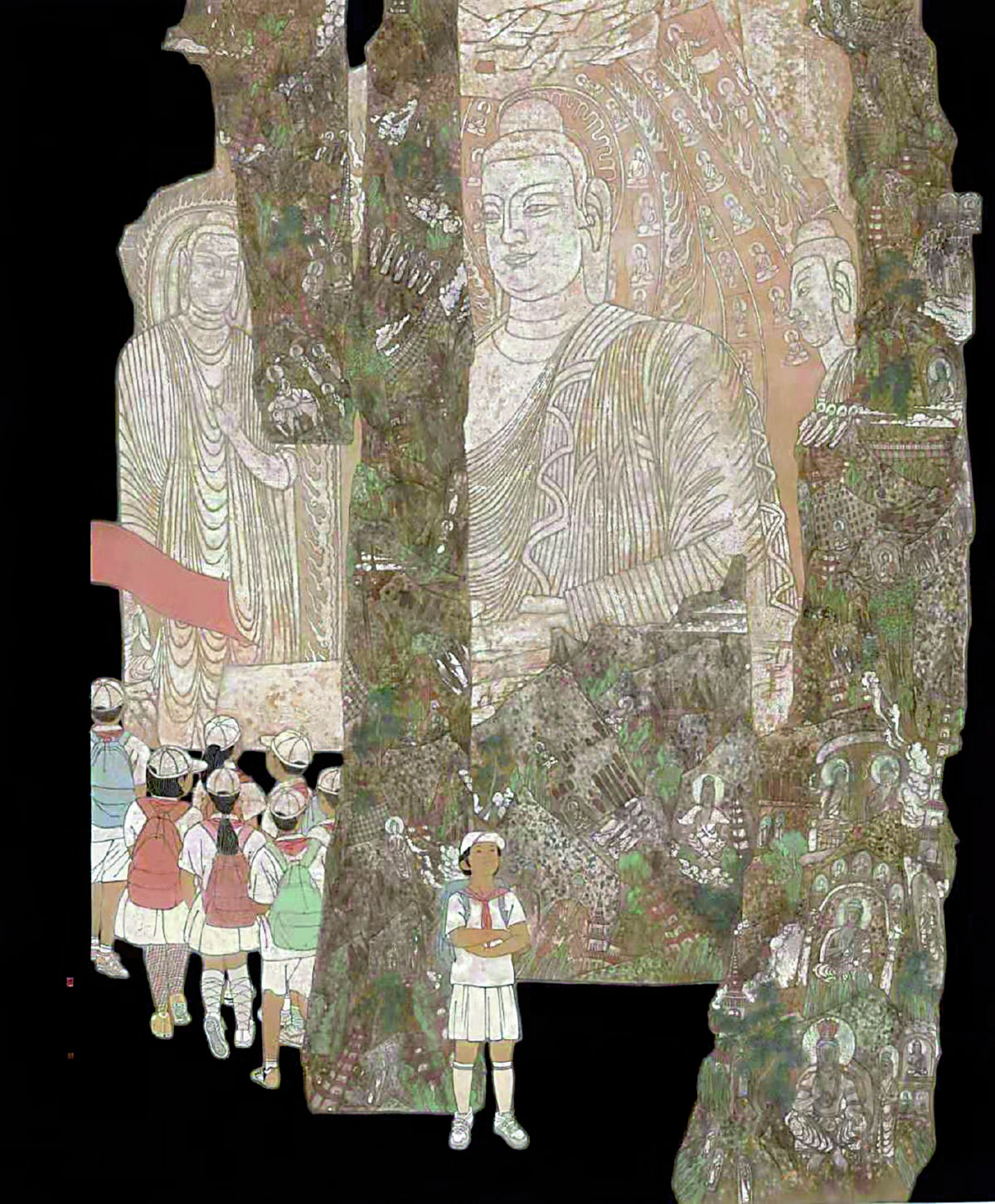 画面的主体体现的是极具山西特色的大同云冈石窟,石窟气势磅礴,造型大气,有着非常明显的时代印记。而“魏”亦取意北魏,因为大同亦是北魏的都城,有着非常深厚的历史底蕴。把释迦大佛作为背景主体,就是想要表达山西的文化遗产的魅力,此处有一语双关之意。前面一群小学生在参观,后面一名小学生正在回味,就是要传达作者传承传统文化的态度。孩子是祖国的未来,他们能够了解我们国家优秀的文化,是国家之大幸,是民族之大幸。我们的下一代,正是我们的未来,可以通过这样的方式去接受历史、传承历史,只有这样,我们民族的宝贵财富才会一直传承下去。