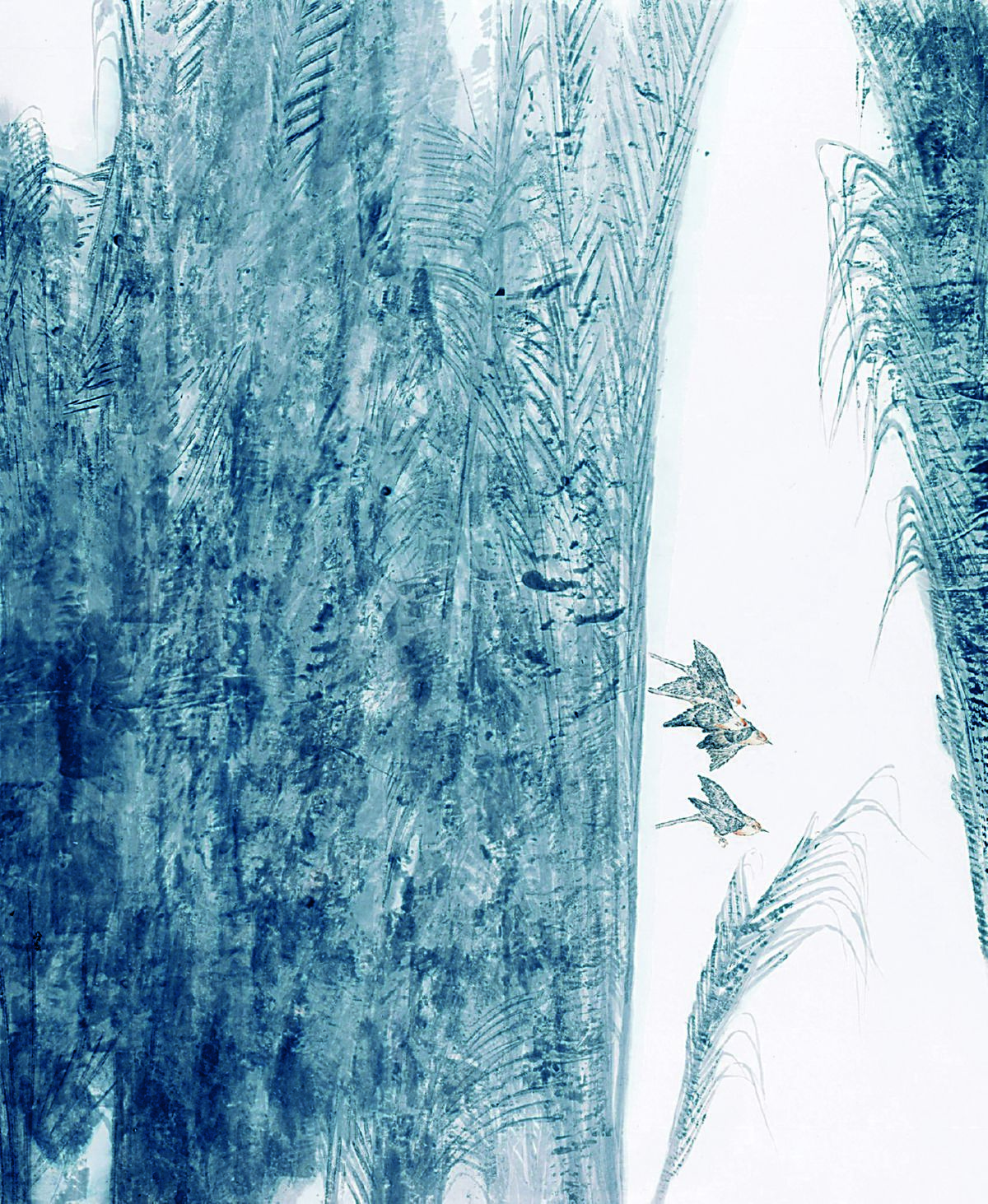 作品是我在写生中,对自然生命本体的认识。感受林间一草一木隐藏的生息之变,以一种平怀之心描写一种萧然物外之趣,贯穿物与物、物与人之间多种不同生命体交融的和谐关系,以粗笔花鸟的形式,表达了我对生命意义的思考和时代精神的理解。以形索影,借助六法中气韵生动、应物象形、经营位置为创作技法,在造型和构图上运用绘画语言,将笔墨巧妙融入画面之中,既强调了表现语言的统一性,也突出画面整体上的对比关系,增强了画面中的节奏和韵律。在右下角借助一枝凤尾竹,强调了形体与质感,加强了画面开合的节奏和变化,体现了自然中生生不息的精神力量。画面在保留了传统笔墨的基础上,打破传统的构图,以平面开合形式来表现大面积凤尾竹,在经历沉寂的夜晚后,于黎明的晨曦中渐渐醒来,晨鸟环林、欢唱觅食的祥和与宁静。