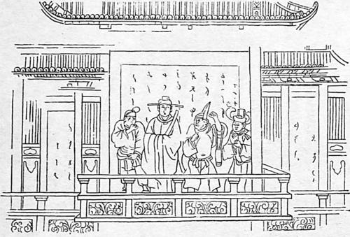 ▲永乐宫潘德冲石椁杂剧线刻摹画