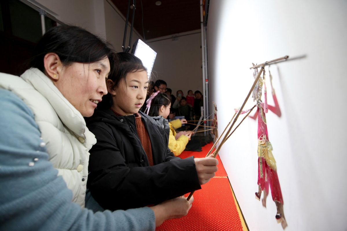 1月17日,在运城博物馆内,小学生体验绛州皮影。