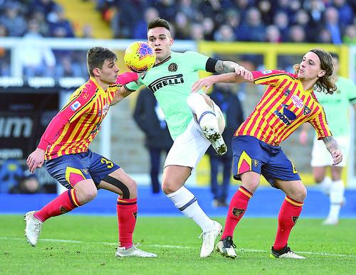 ▲1月19日,国际米兰队球员劳塔罗·马丁内斯(中)在比赛中和莱切队球员奥尔科(左)、彼得里乔内拼抢。 当日,在2019~2020赛季意大利足球甲级联赛第20轮比赛中,国际米兰队客场以1比1战平莱切队。 新华社发