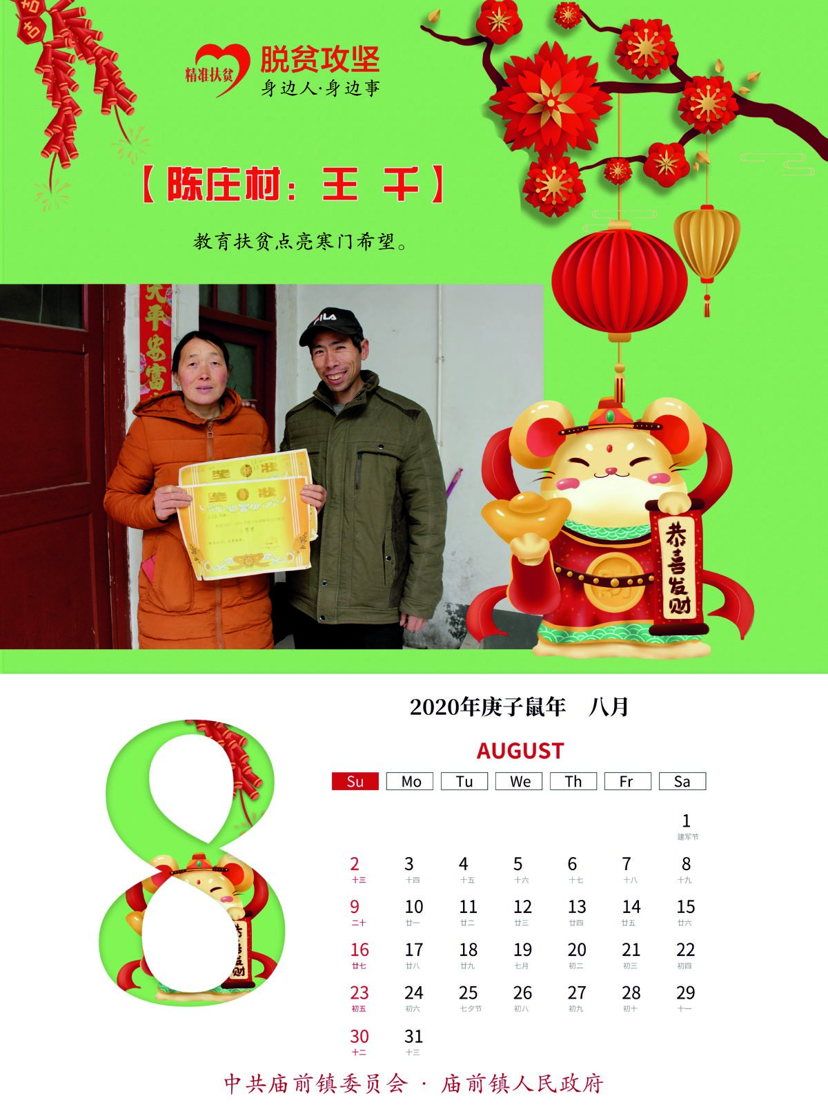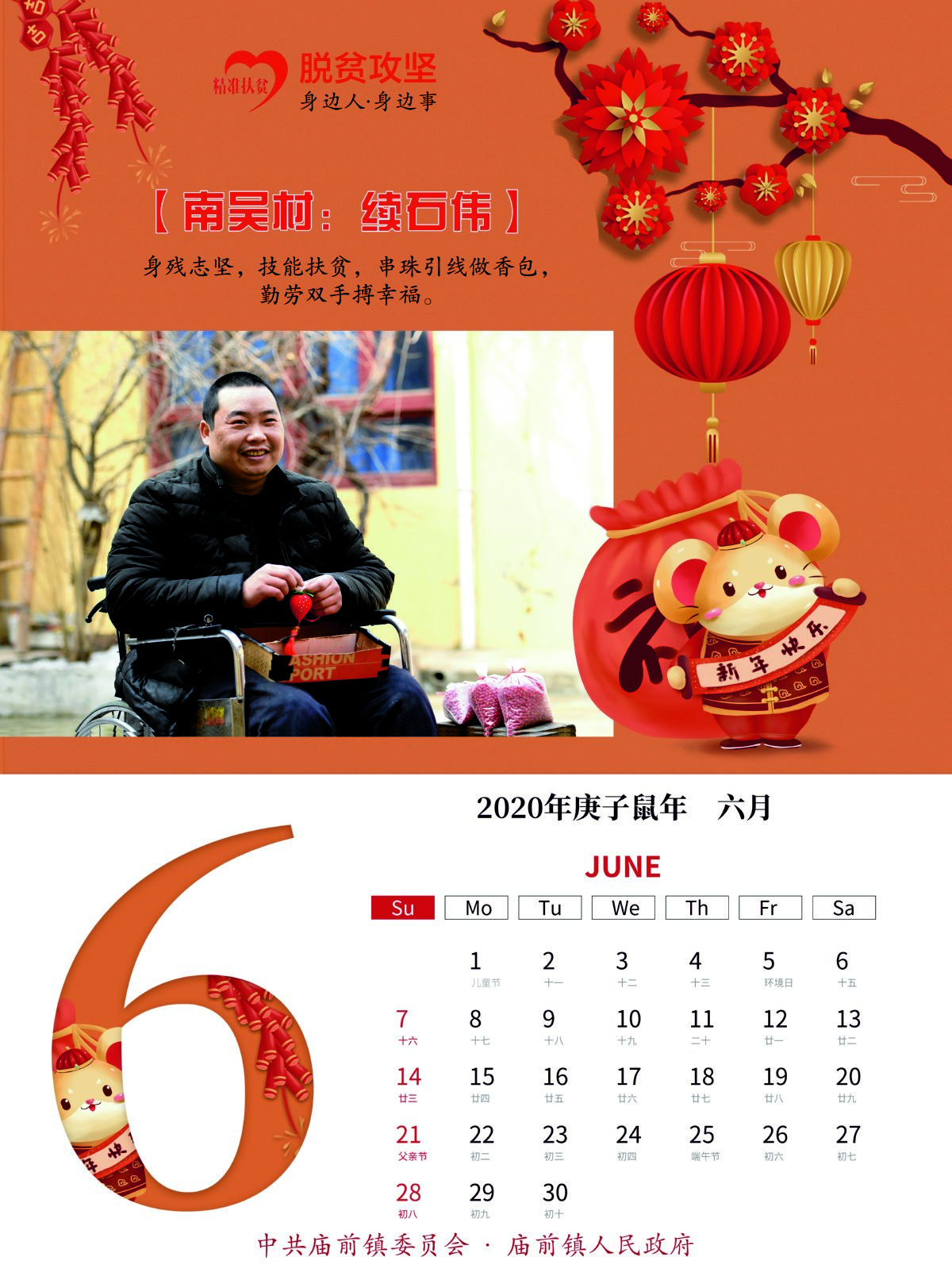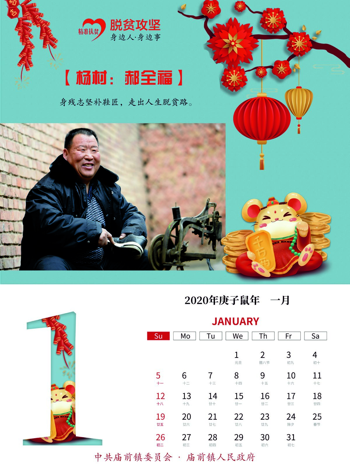 经过前期各村发现、筛选和最后综合评比,12个展现该镇贫困群众自强自立、不等不靠、勇于脱贫的典型事例,融入这本挂历中。挂历采用月历式设计,每月的上半部分均选用各具代表性的脱贫人物劳动画面和事迹简介,下半部分是每月月历;封面选用该镇易地扶贫搬迁集中安置点242户新居落成图。挂历封面以中国红为底色,内页画面人物露出开心的笑容,配以传统的灯笼、福娃等吉祥物装点,营造出喜庆热烈、欢乐祥和的节日氛围。