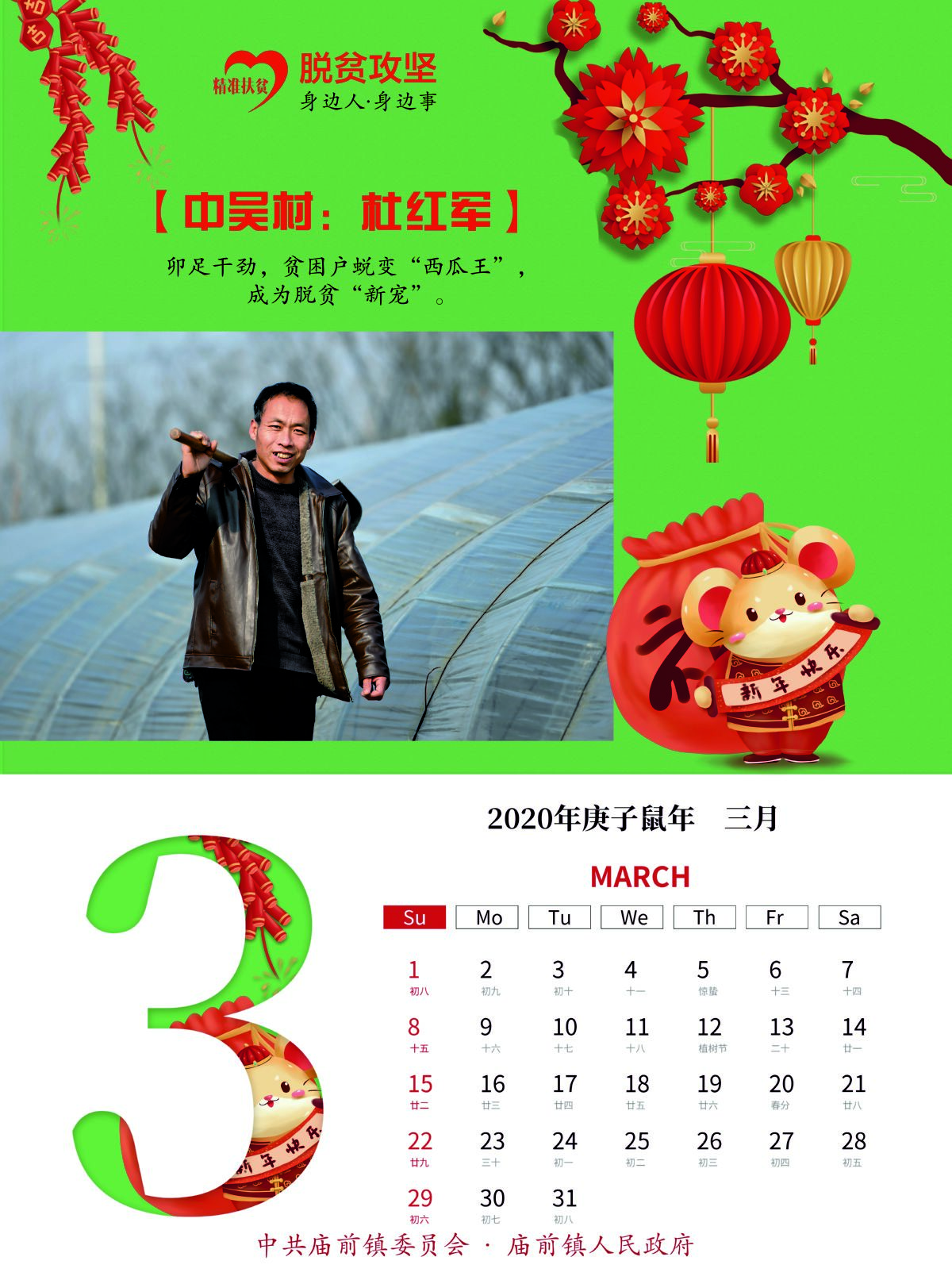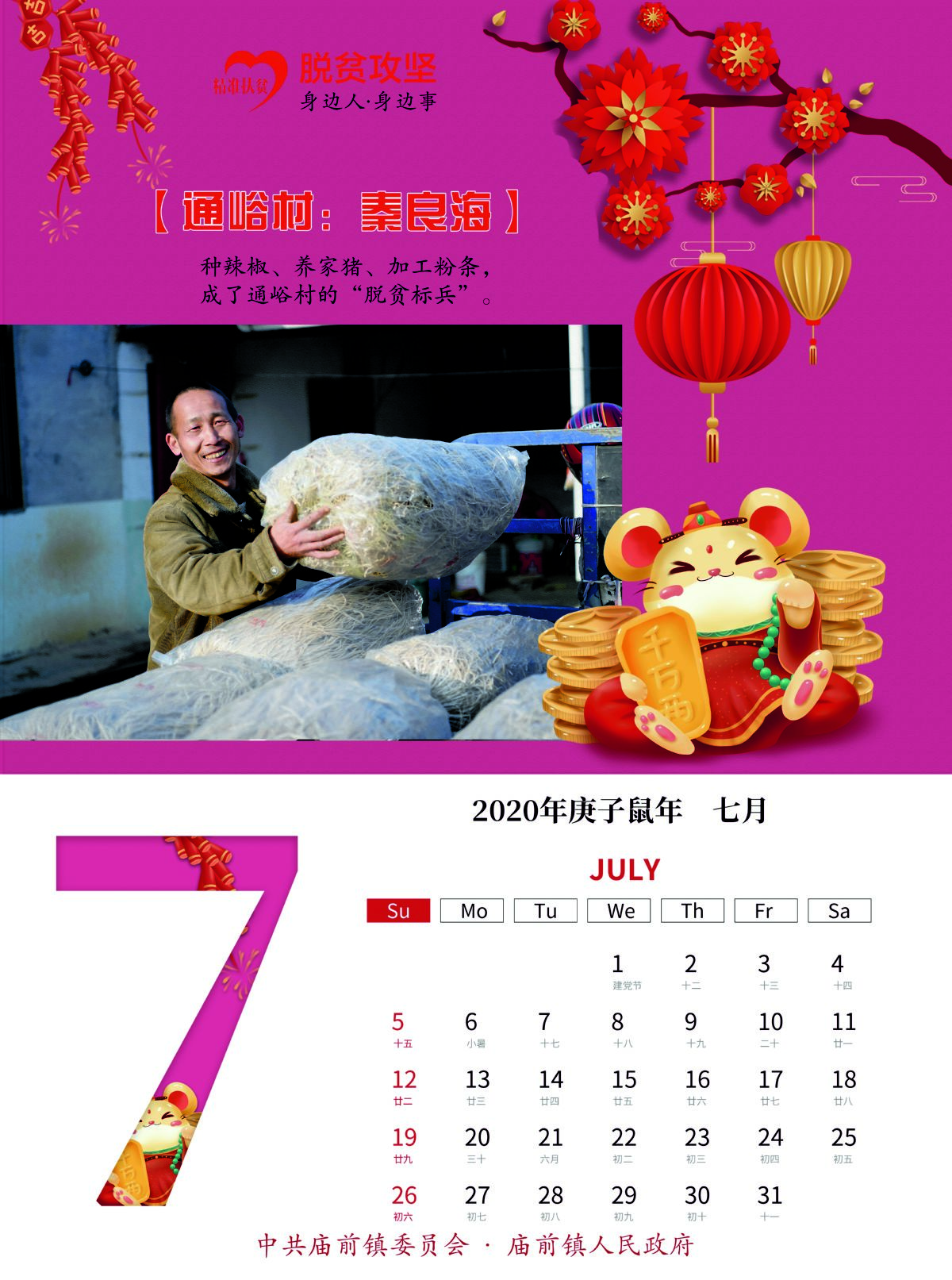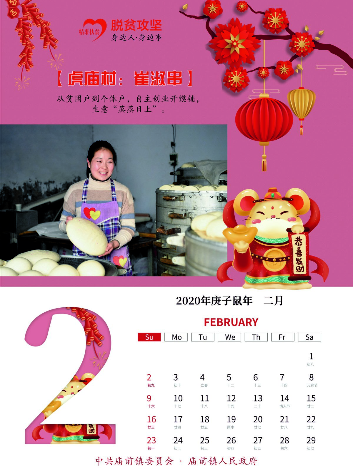 经过前期各村发现、筛选和最后综合评比,12个展现该镇贫困群众自强自立、不等不靠、勇于脱贫的典型事例,融入这本挂历中。挂历采用月历式设计,每月的上半部分均选用各具代表性的脱贫人物劳动画面和事迹简介,下半部分是每月月历;封面选用该镇易地扶贫搬迁集中安置点242户新居落成图。挂历封面以中国红为底色,内页画面人物露出开心的笑容,配以传统的灯笼、福娃等吉祥物装点,营造出喜庆热烈、欢乐祥和的节日氛围。