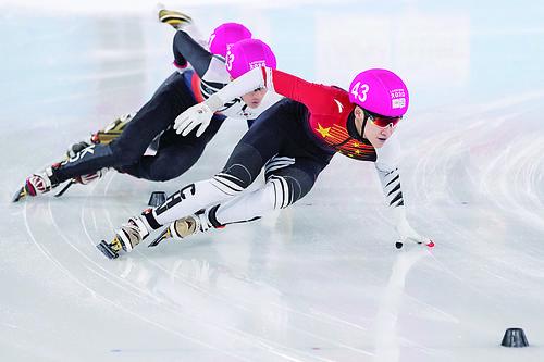 ▶1月20日,中国选手张添翼(右)在半决赛中。 当日,在第三届冬季青年奥林匹克运动会短道速滑男子500米决赛中,中国选手张添翼以48秒570的成绩获得铜牌。 新华社发