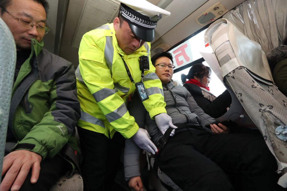 ▲民警检查乘客系安全带情况 李政奇 摄