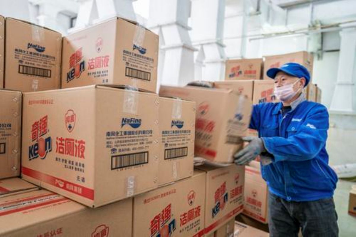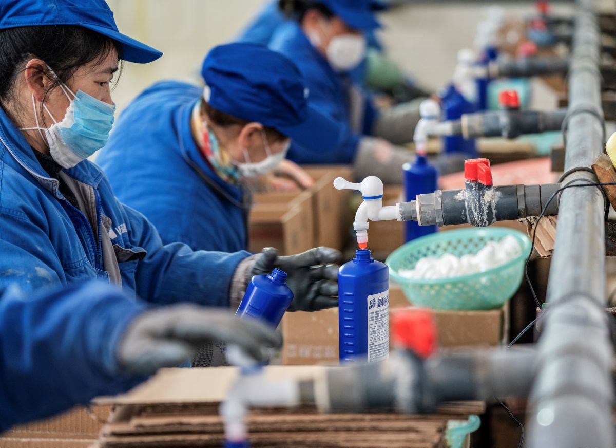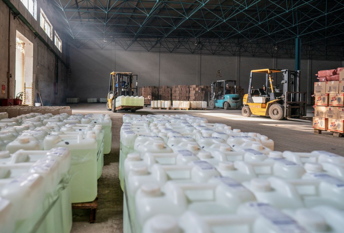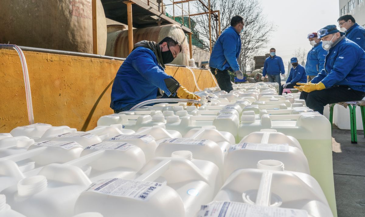 运城南风集团山西日化销售有限公司是生产消毒液等产品的企业。为了做好医疗防控物资保障工作,该公司100余名员工放弃节日休息时间,从正月初三开始上班,昼夜不停加紧生产,消毒液产量已经由原来日生产16吨左右提高到现在的50吨左右。该公司生产的消毒液主要分大桶、小桶两种包装,大桶主要供应厂矿、企业事业单位、行政机关、社区等,小桶主要提供给超市、居民家庭等。这是记者1月30日在该公司拍摄的一组镜头。 本报记者 高志勇 摄