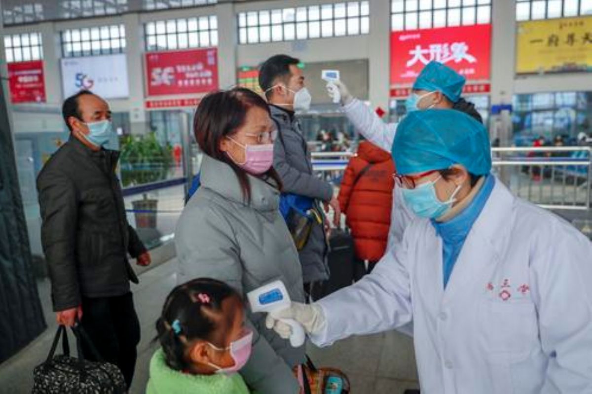 1月28日,在运城北站入口监测点,市第三医院医护人员对旅客测量体温。记者 闫 鑫 摄