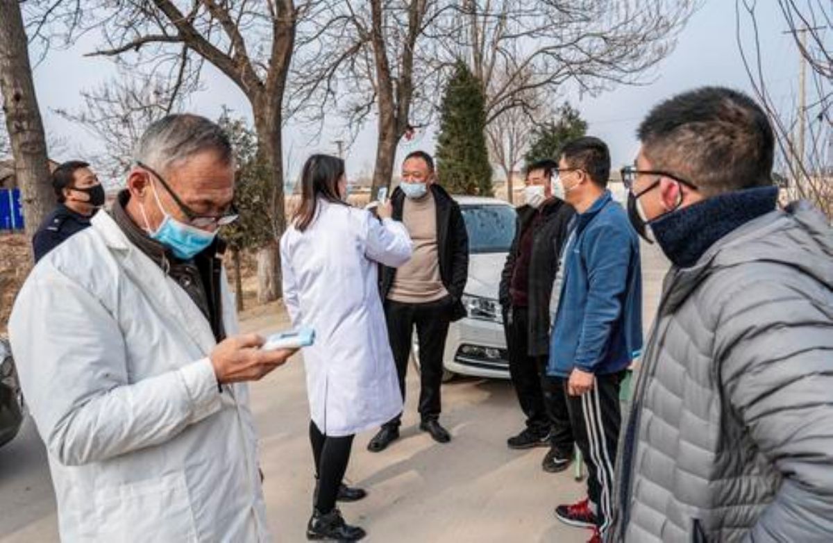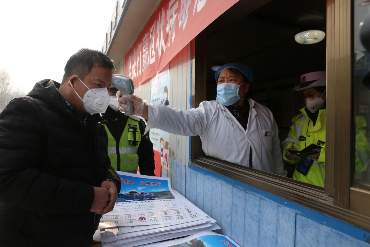 1月28日,防疫人员在夏县庙前段严格检测。特约摄影 张秀峰 摄