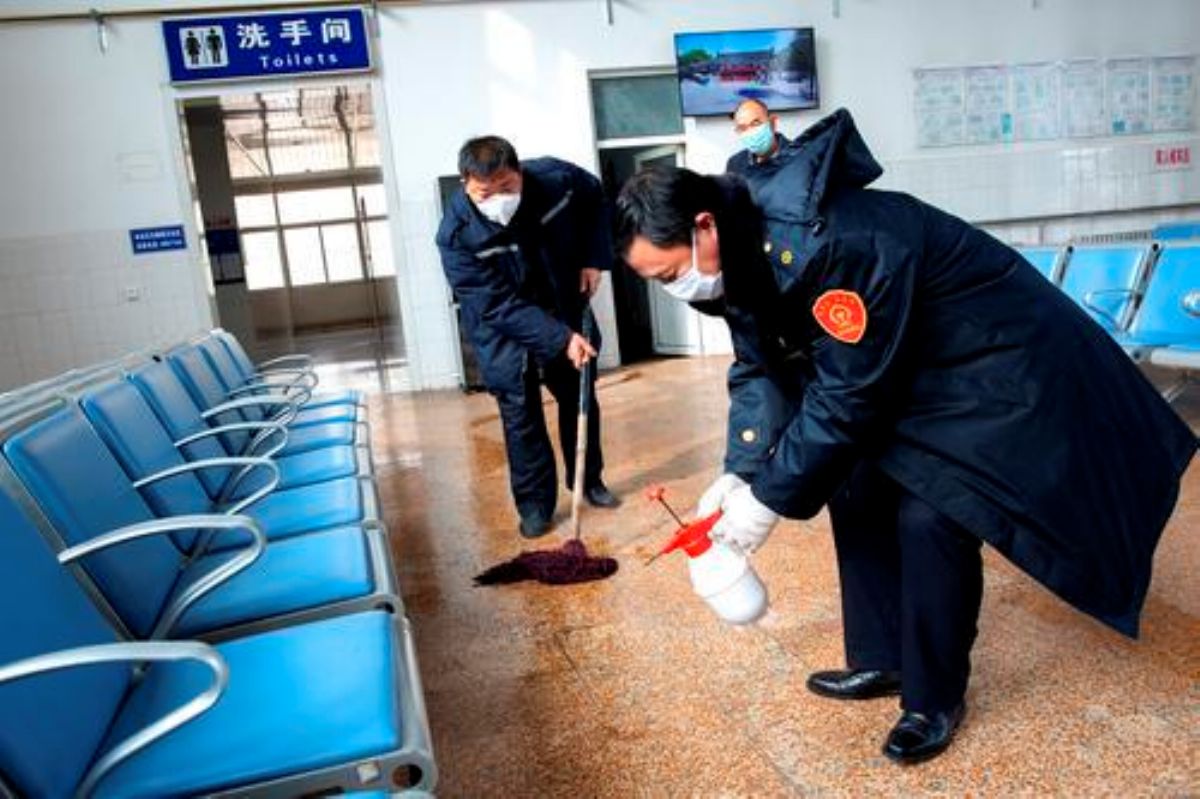 永济高铁站对候车厅进行消毒。 特约摄影 王文华 摄