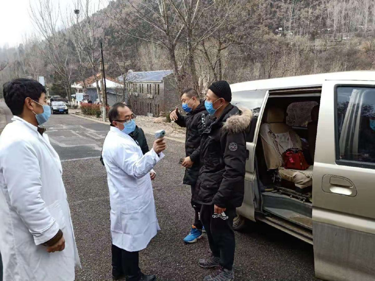 1月27日,夏县祁家河乡卫生院医务人员为过往人员量体温。