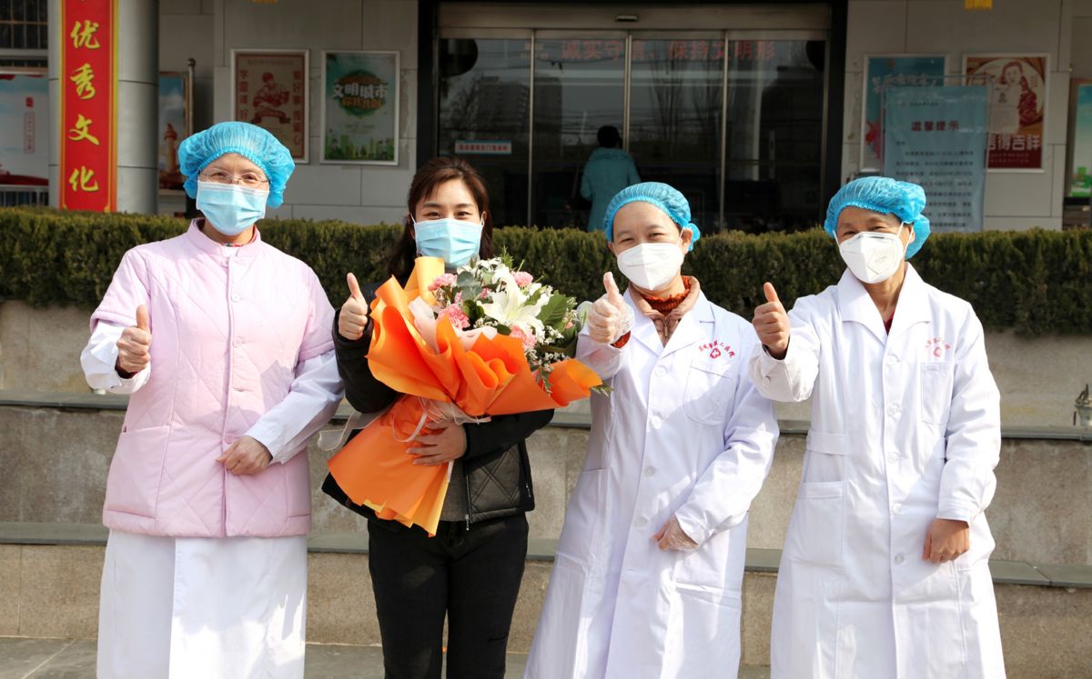 ▲2月2日,我市首例新型冠状病毒感染的肺炎确诊患者治愈出院。这是她出院时与市第二医院医护人员合影。 景冬波 摄