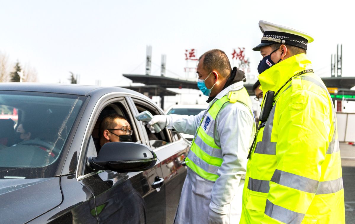 ▲民警对高速出口车辆驾驶人进行体温检测 樊朋展 摄