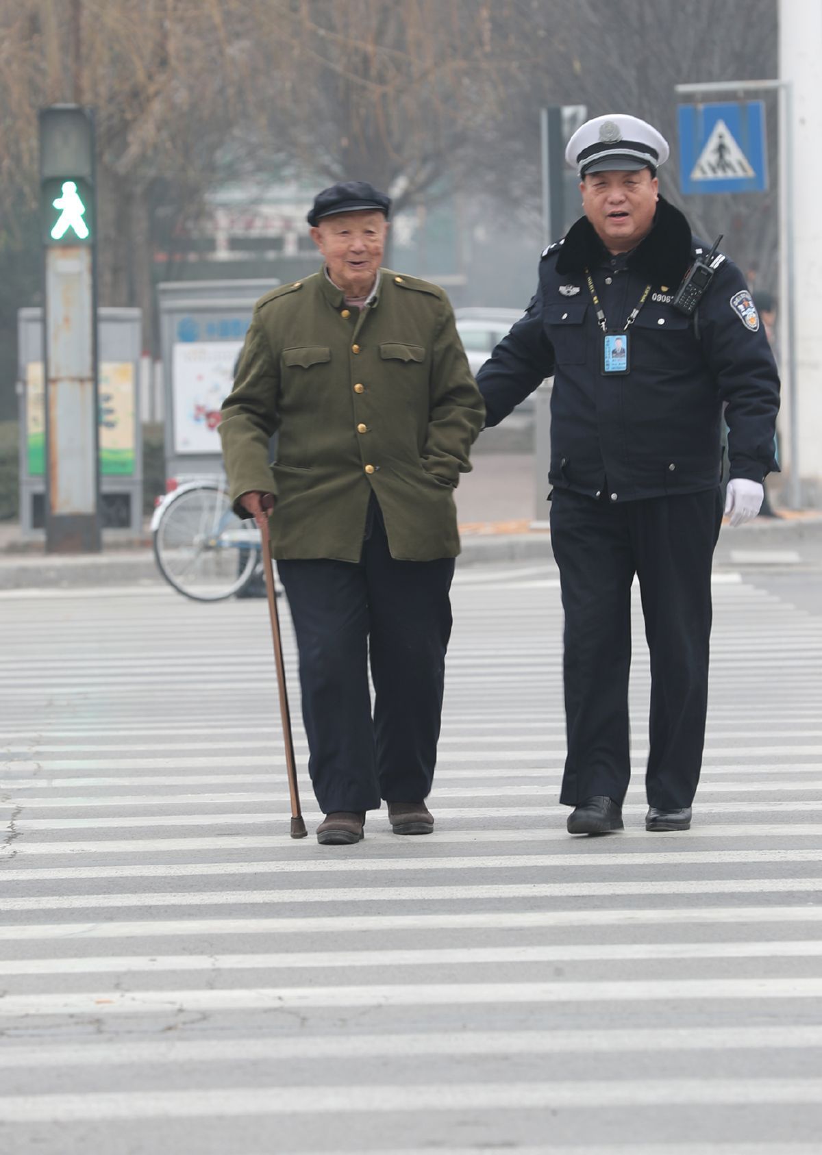 蔡高雨搀扶腿脚不便的老人过马路 记者 卫行智 摄