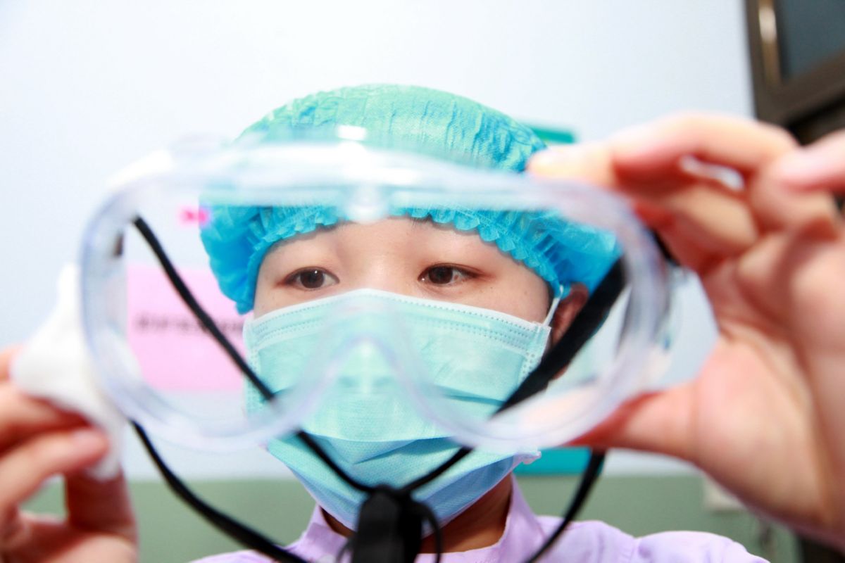 市第二医院护士秦亚娜在擦拭防护镜 记者 景冬波 摄