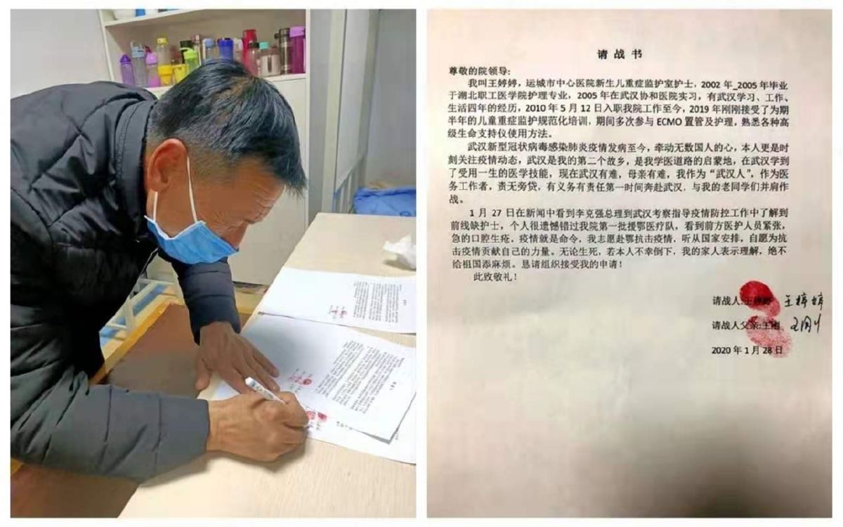 ▲王婷婷的父亲王刚在签请战书 (运城市中心医院供图)