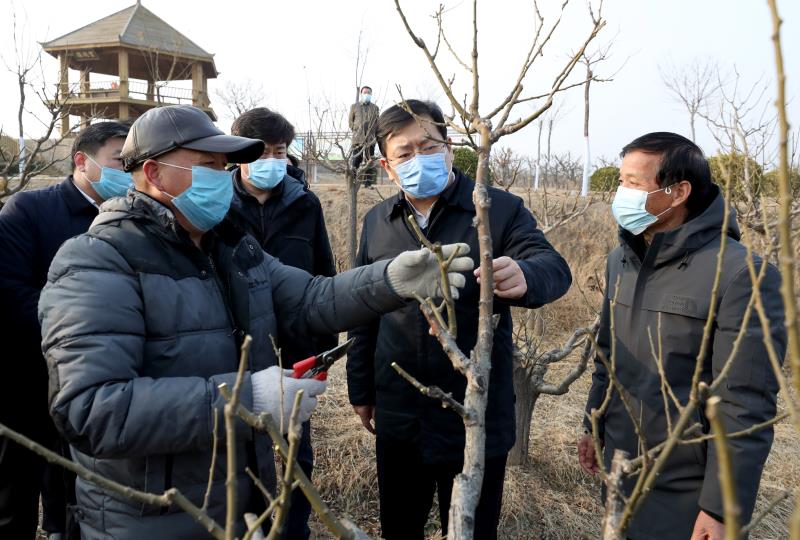 河东春来早,农耕正当时。丁小强十分关注疫情防控期间的春耕备耕情况。在北相镇山西金鼎农作物良种科研示范基地,小麦春浇正在进行。丁小强详细了解育种、施肥、喷灌、用药和基地收益等情况。他指出,要切实做好疫情防控,加紧春耕备耕,精准灌溉、科学用肥,切实提高小麦品质,充分发挥基地的示范作用。泓芝驿镇疫情防控监测点,党旗高扬,丁小强认真检查防控措施落实、人员进出管控等情况,对党员带头参加防控给予充分肯定。该镇万亩酥梨基地,果农们正在忙着间伐、春浇。丁小强叮嘱村民要加强自我防护,做好春季管护,不误农时农活,为今年丰收做足准备;要立足基地规模优势,举办高品质梨花节,带动收入持续增长。王范乡郑村大棚内冬枣春芽萌发,桃树新果初长。丁小强向正在劳作的农民虚心请教管理技术,了解大棚收益情况。他要求,要加强田间技术指导,大力培养农业经纪人,进一步开拓市场。在三路里镇万亩双季槐基地,丁小强向双季槐带头人雷茂端了解品种改良、亩均收入、槐米产品开发等情况,与正在修剪的农民深入交流。他指出,要深入推进槐米深加工,瞄准小众化市场,开发多元化产品,赋予河东文化内涵,做大做强槐米产业。
