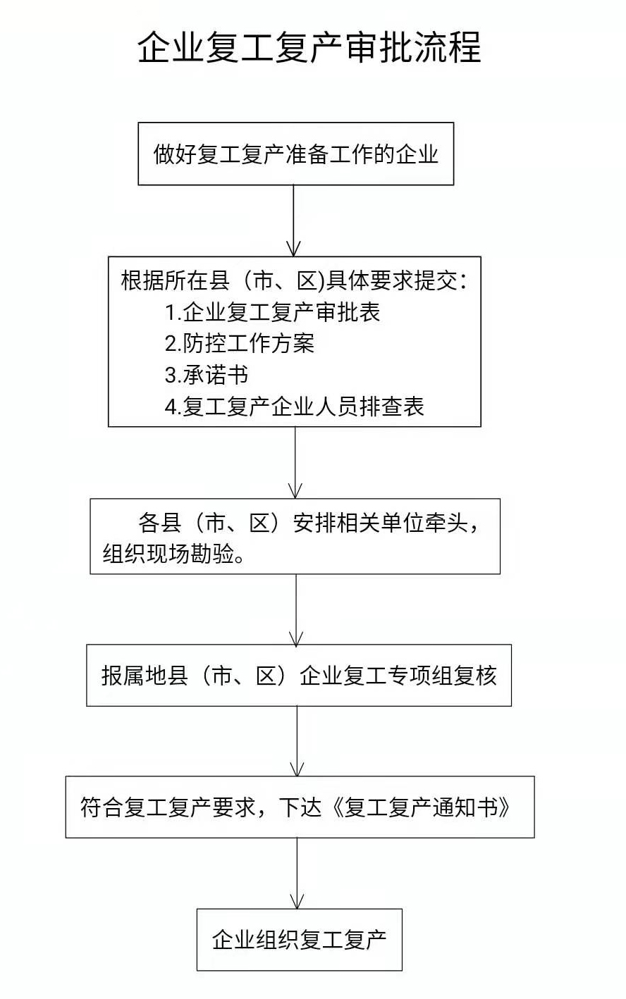 符合复工复产条件的企业,提出书面申请,提交复工复产审批表、防控工作方案、人员排查表、承诺书等相关材料。企业复工复产申请,按照属地管理,由各县(市、区)、运城开发区确定牵头单位,组织现场勘验后,符合复工复产要求的,报企业复工专项组审核后,下发复工复产通知书后方可复工复产。