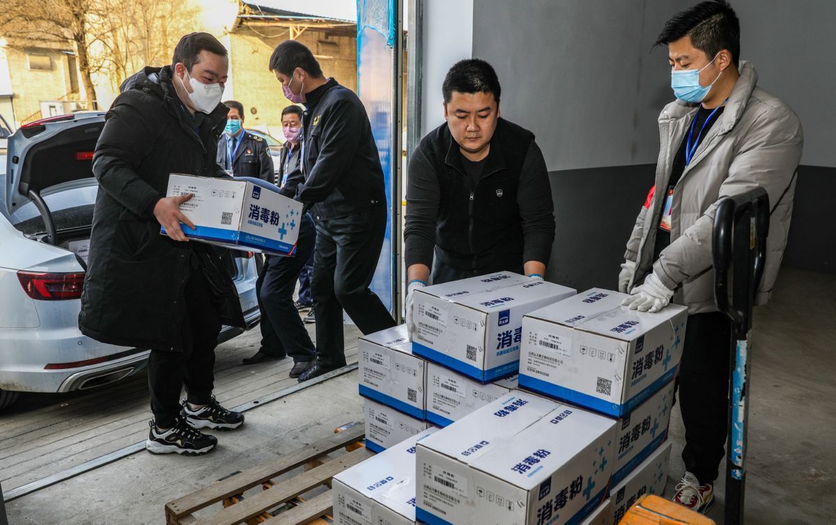 2月9日,盐湖区应急物资储备库工作人员将捐赠的消毒物资卸车入库。