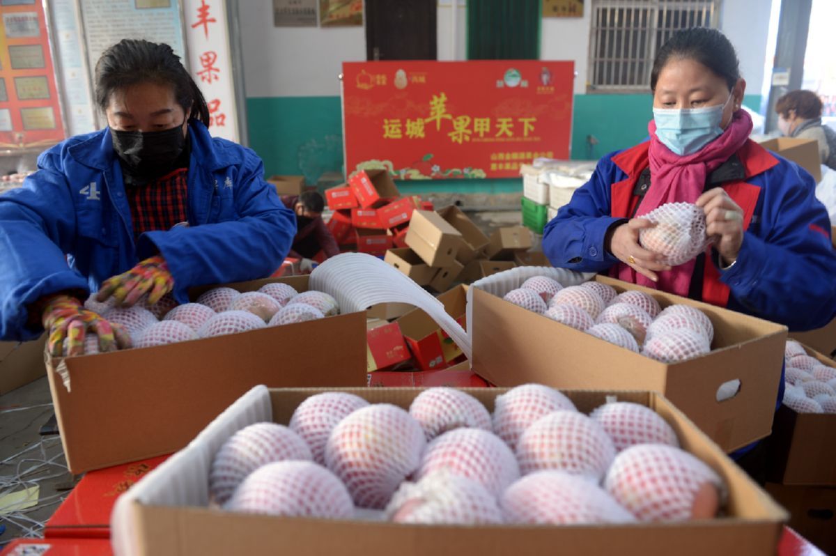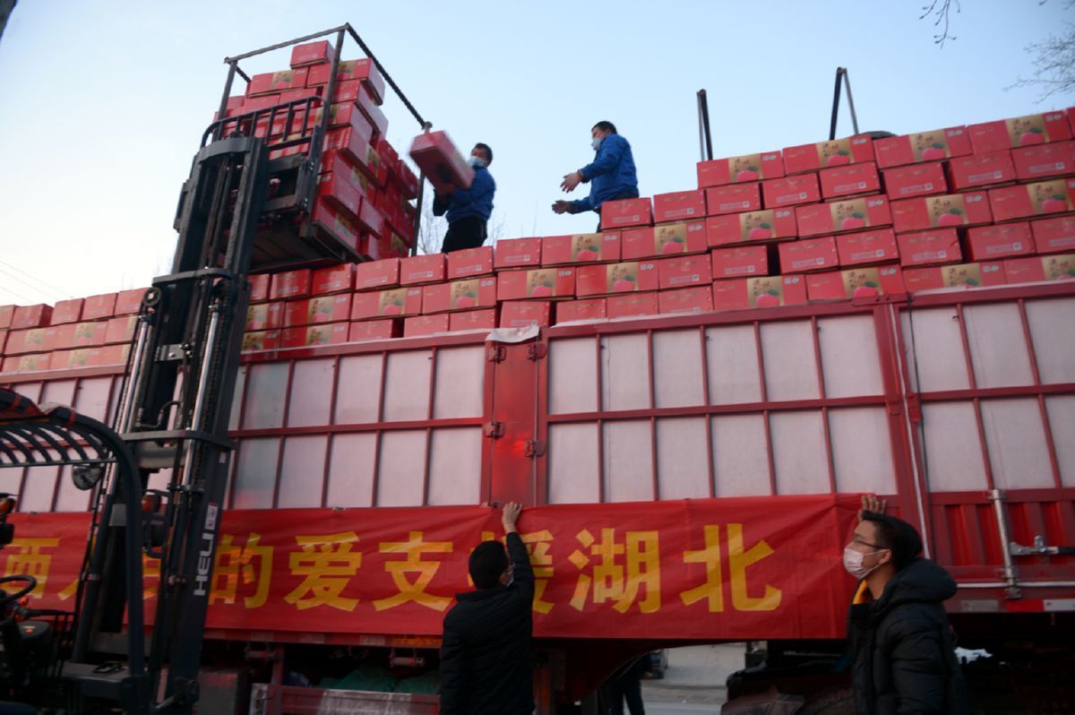 2月10日下午,由运城果农精心挑选捐赠的300吨红富士苹果,代表着全省3000多万人民的心意,装车发往湖北省。 本报记者 冯革才 摄