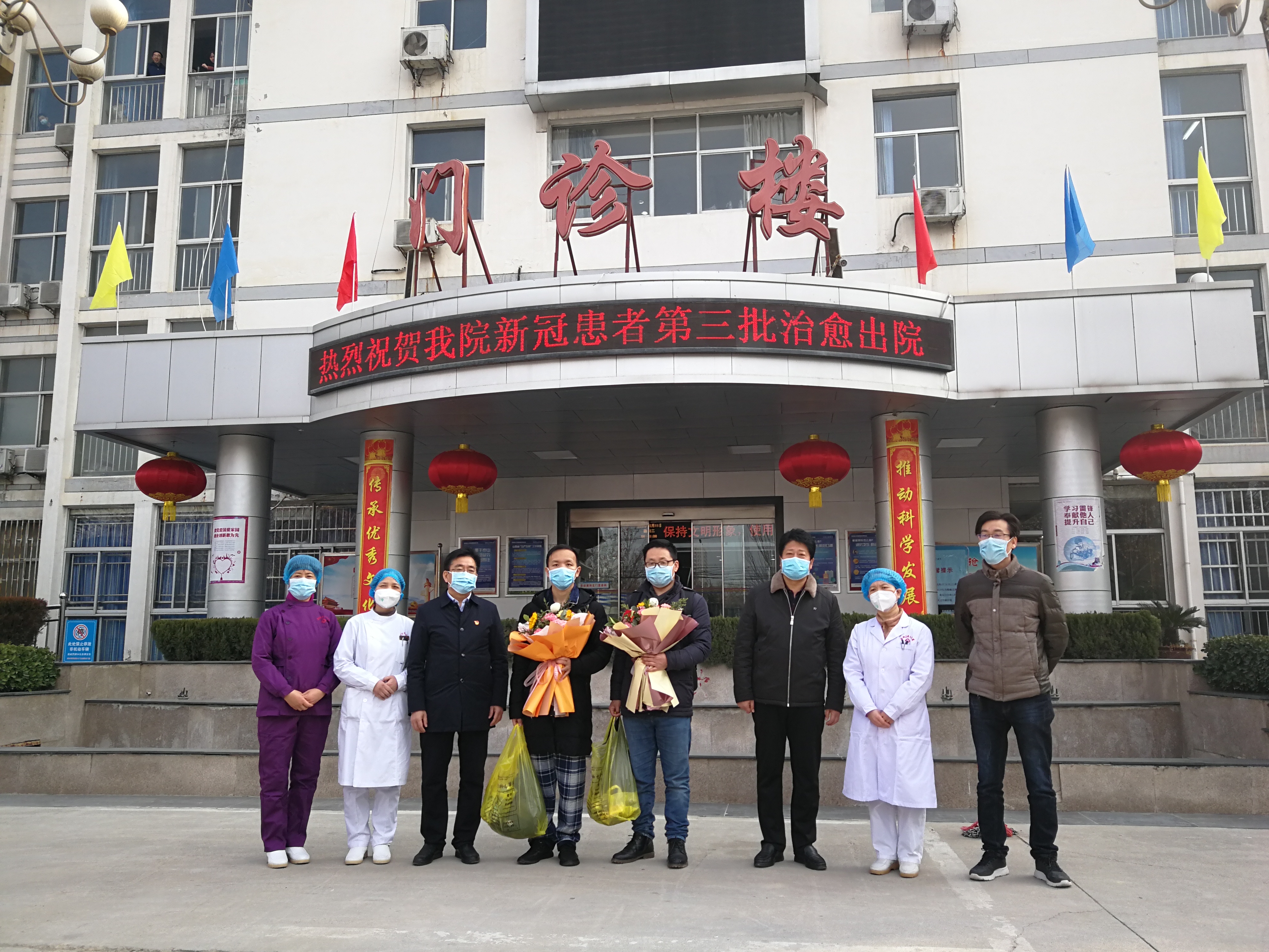 2月11日,我市治愈出院的新冠肺炎患者魏某、许某手捧医护人员送上的鲜花,在运城市第二医院门口留影。 刘凯华 摄