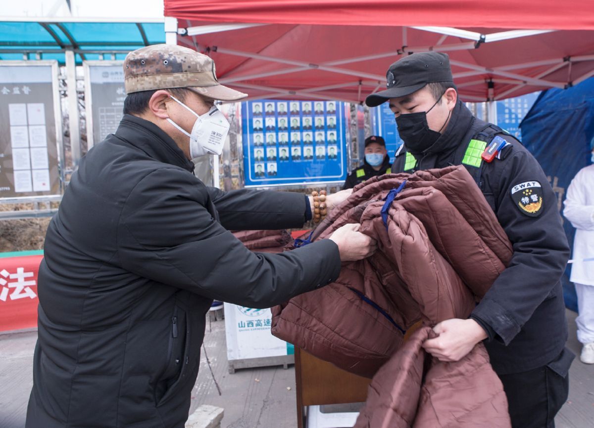 ▲2月14日,万荣县应急管理局人员将保暖大衣送到该县高速路西口的疫情检测点。