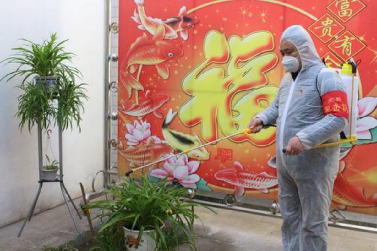 ▲2月19日,闻喜县中城社区闻中小区网格员兼巷道长杨晓尚,在逐家逐户喷洒消毒液。