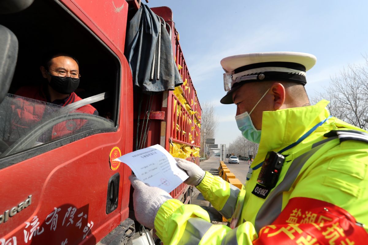 2月18日,盐湖交警大队公路巡警中队民警,在运城西高速口疫情防控检查站,对运送应急民生、复工复产、救援物资的车辆优先放行。