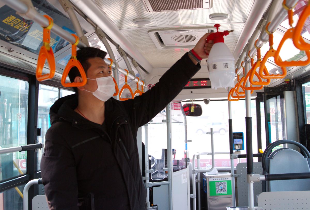 ▲公交公司工作人员对车厢内重点区域进行消毒 樊朋展 摄