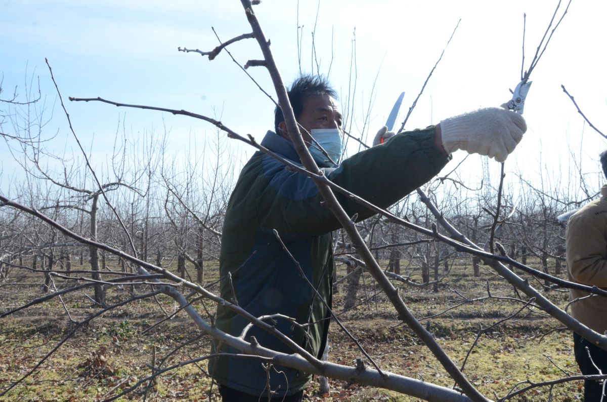 ▲果树修剪队的师傅正在给果树剪枝 刘凯华 摄