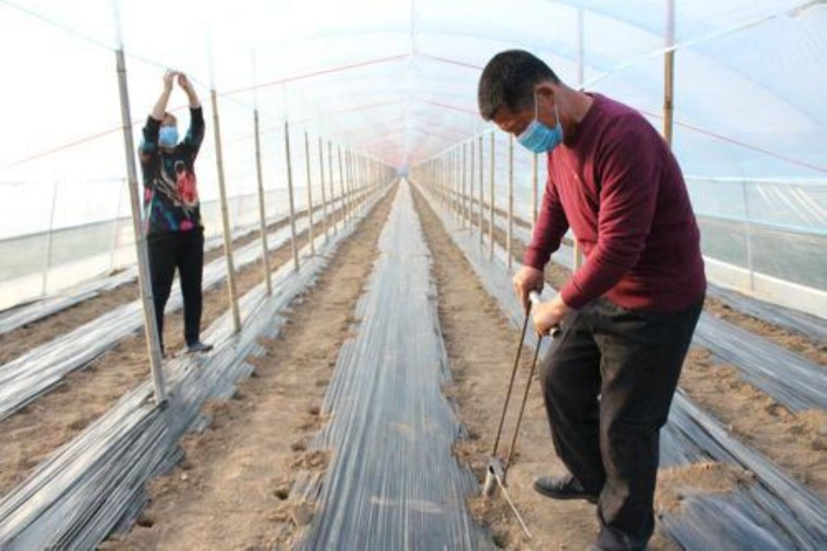 ▲2月19日,闻喜县桐城镇西官庄村共产党员崔俊学夫妇,在大棚内整地开穴,准备栽植“盛开花”品牌甜瓜。