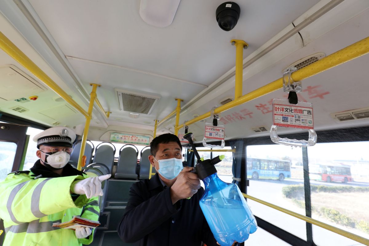 为做好城市公共运输车辆恢复运营工作,确保群众安全乘车,当日,河津市交警队组织民警,对准备恢复运营的3路、11路和8路的消毒工作进行检查,督促驾驶员对扶手、投币箱、刷卡机、车门和行李架进行清洁、消毒,营造安全的乘车环境。 特约摄影 李泓晓