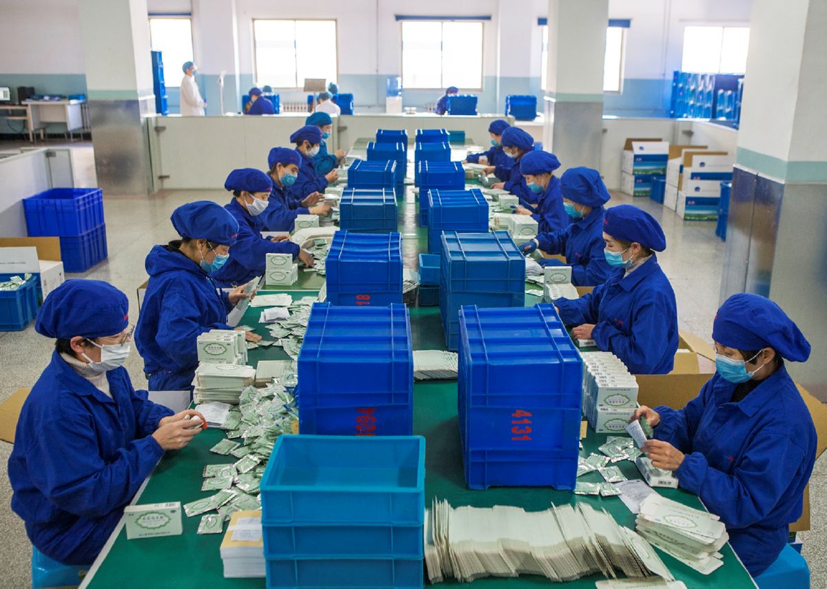 ▲2月17日,山西华康药业有限公司员工在将成袋的参苓白术丸装盒。近期,该公司开足马力,生产了各种中成药6万多箱。