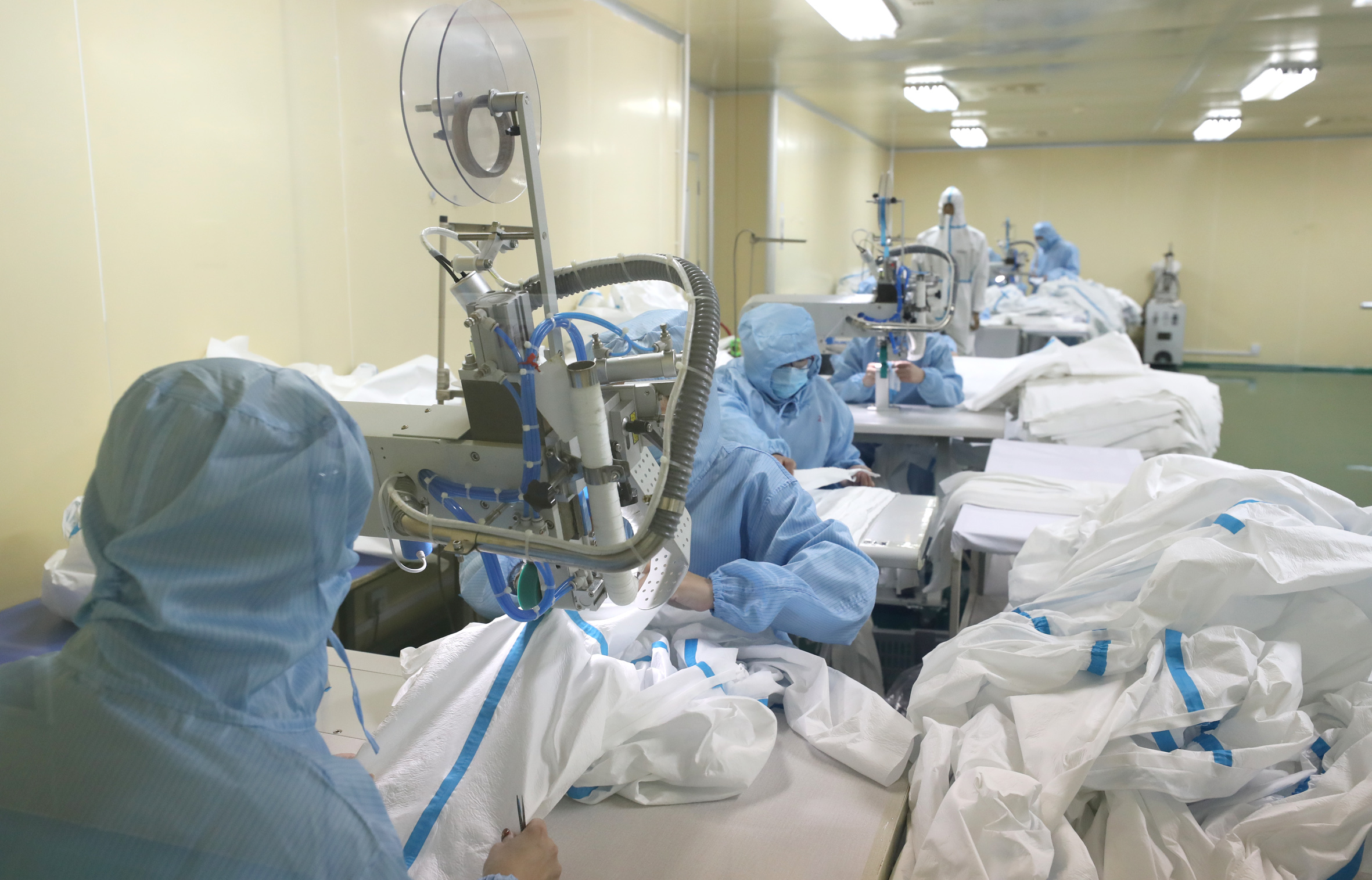 际华3534用天源药业免费提供的无菌车间,加班加点赶制防护服 本报记者 雷哲侠 摄