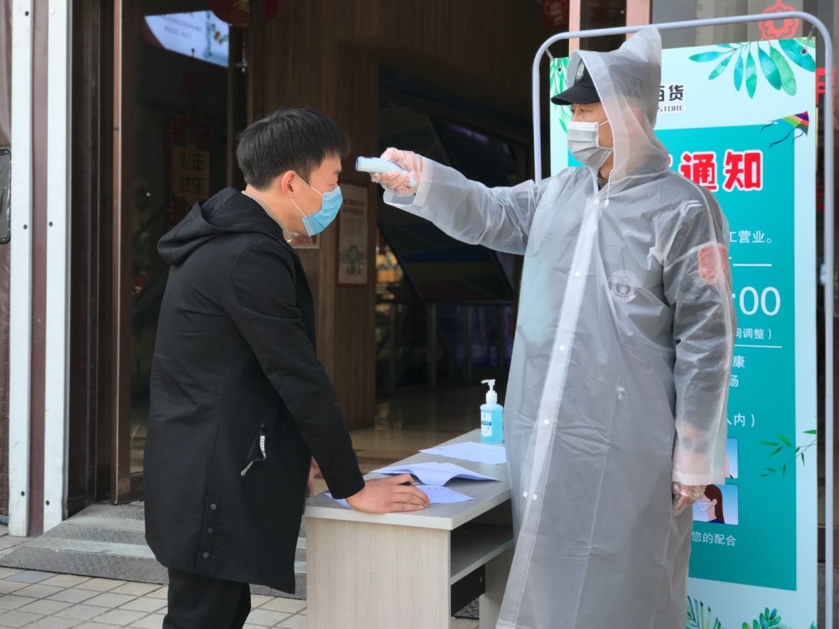 ▲在市区南风百货出入口,工作人员为顾客测量体温。王棉 摄