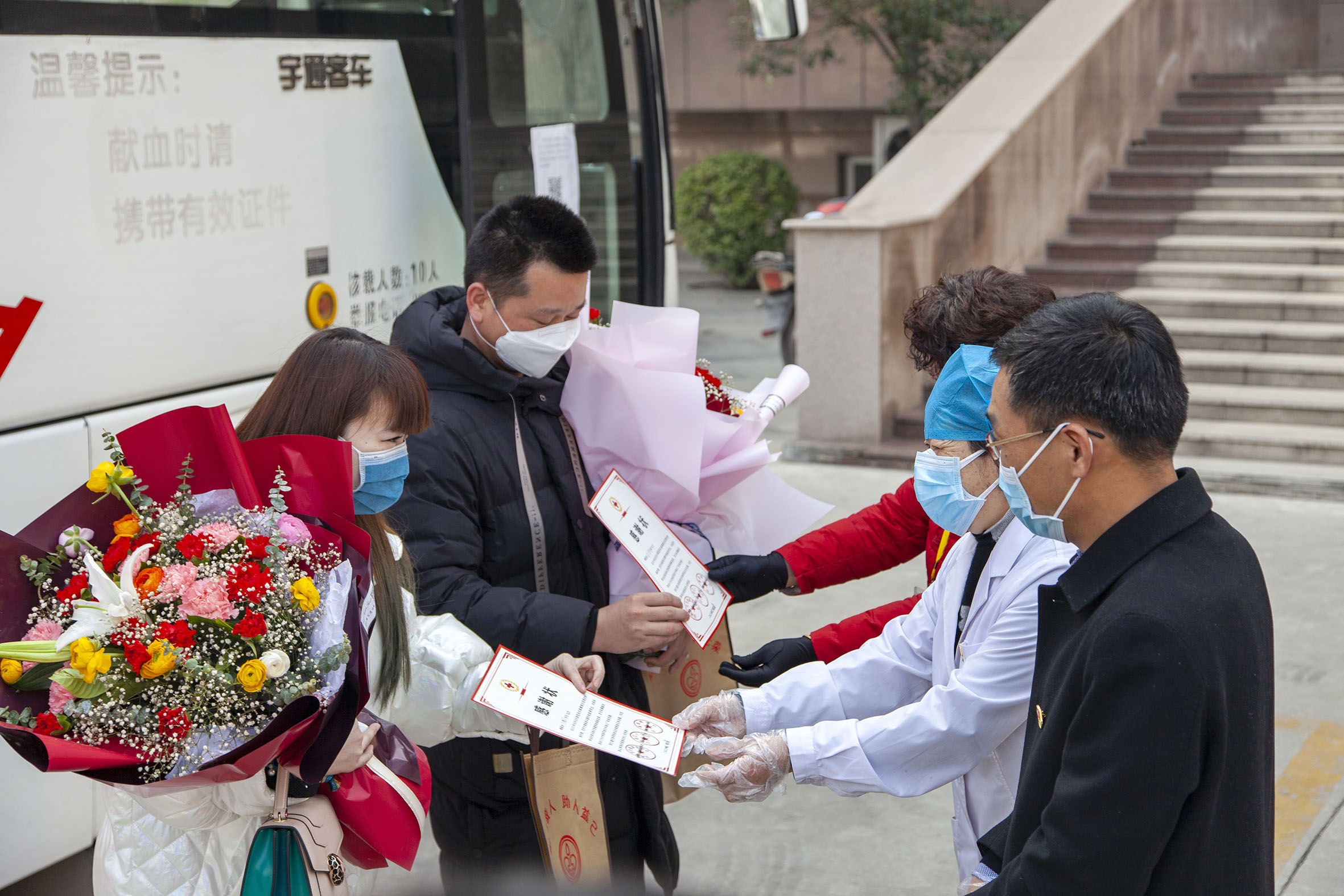 运城市中心血站和运城红十字会相关负责人,将省卫健委、省红十字会、省血液中心颁发的感谢状送到两名捐献血浆的志愿者手上。景冬波 摄