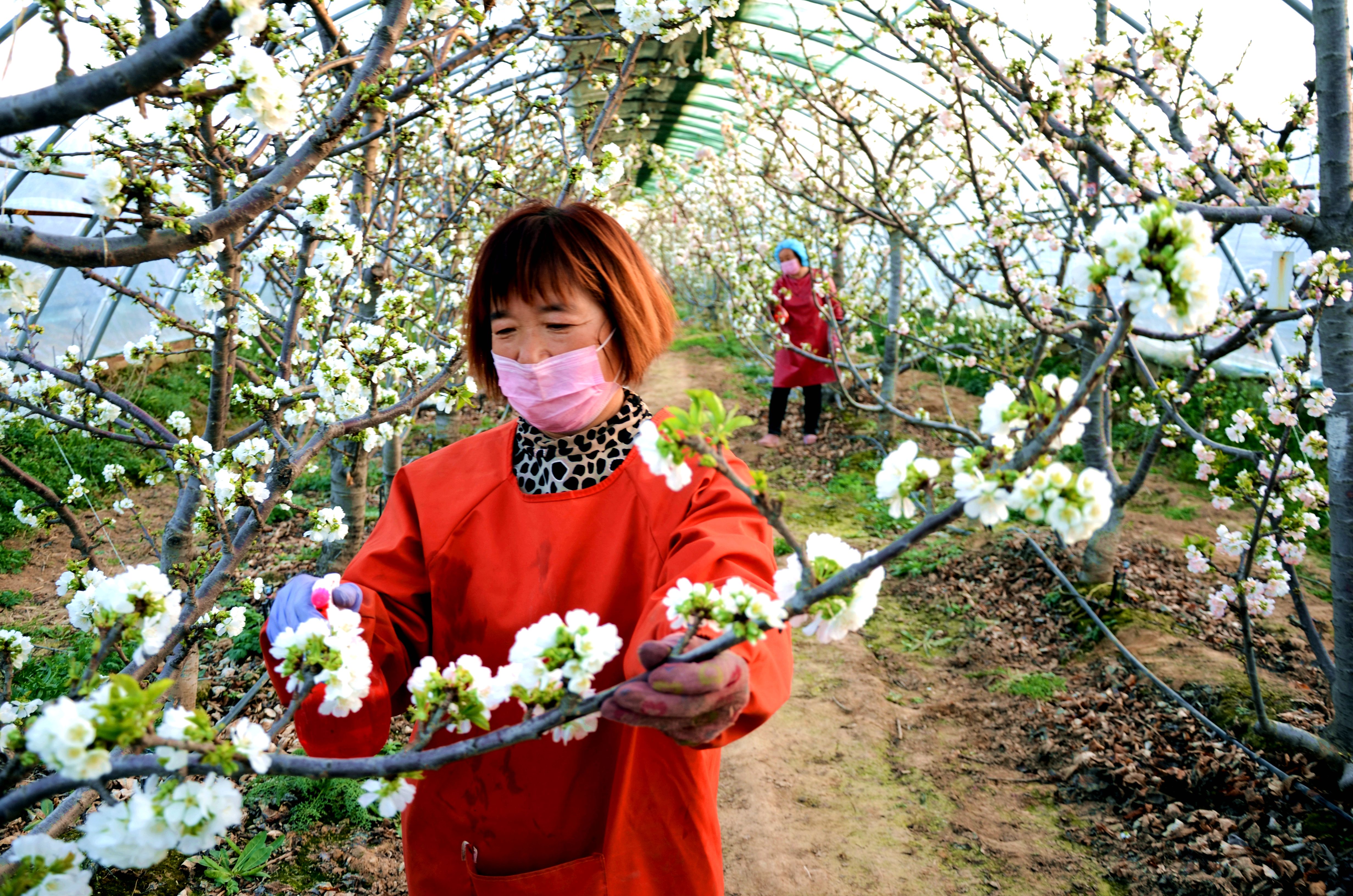 2月21日,万荣县南张乡尚家村的尚农樱桃专业合作社社员在给樱桃授粉。