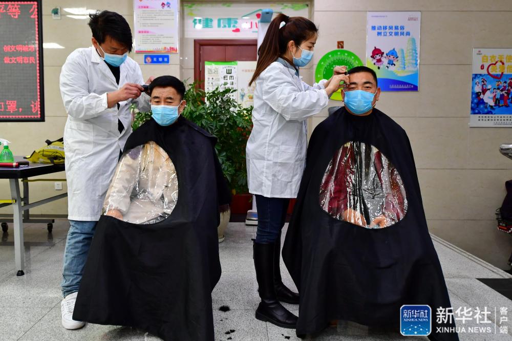 志愿者为山西太原晋源区疾控中心的工作人员理发(2月24日摄)。新华社记者 曹阳 摄