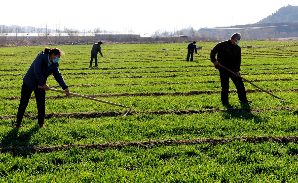 2月24日,垣曲县王茅镇寨里村明瑞种植合作社组织村民在麦田中除草。 特约摄影 崔松良 摄