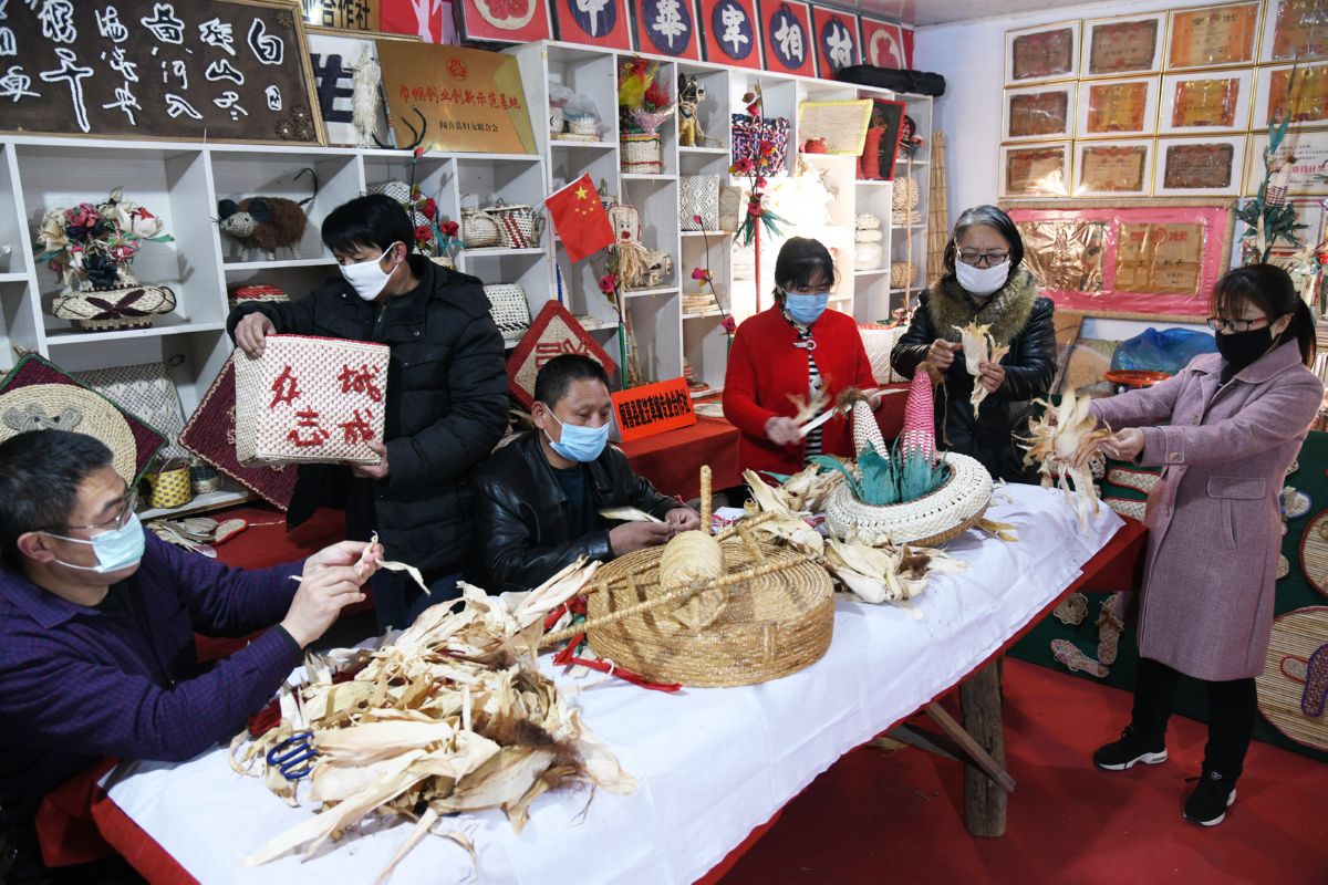 2月26日,闻喜县篷笠草编专业合作社组织社员编织玉米皮工艺品,促进农民增收。