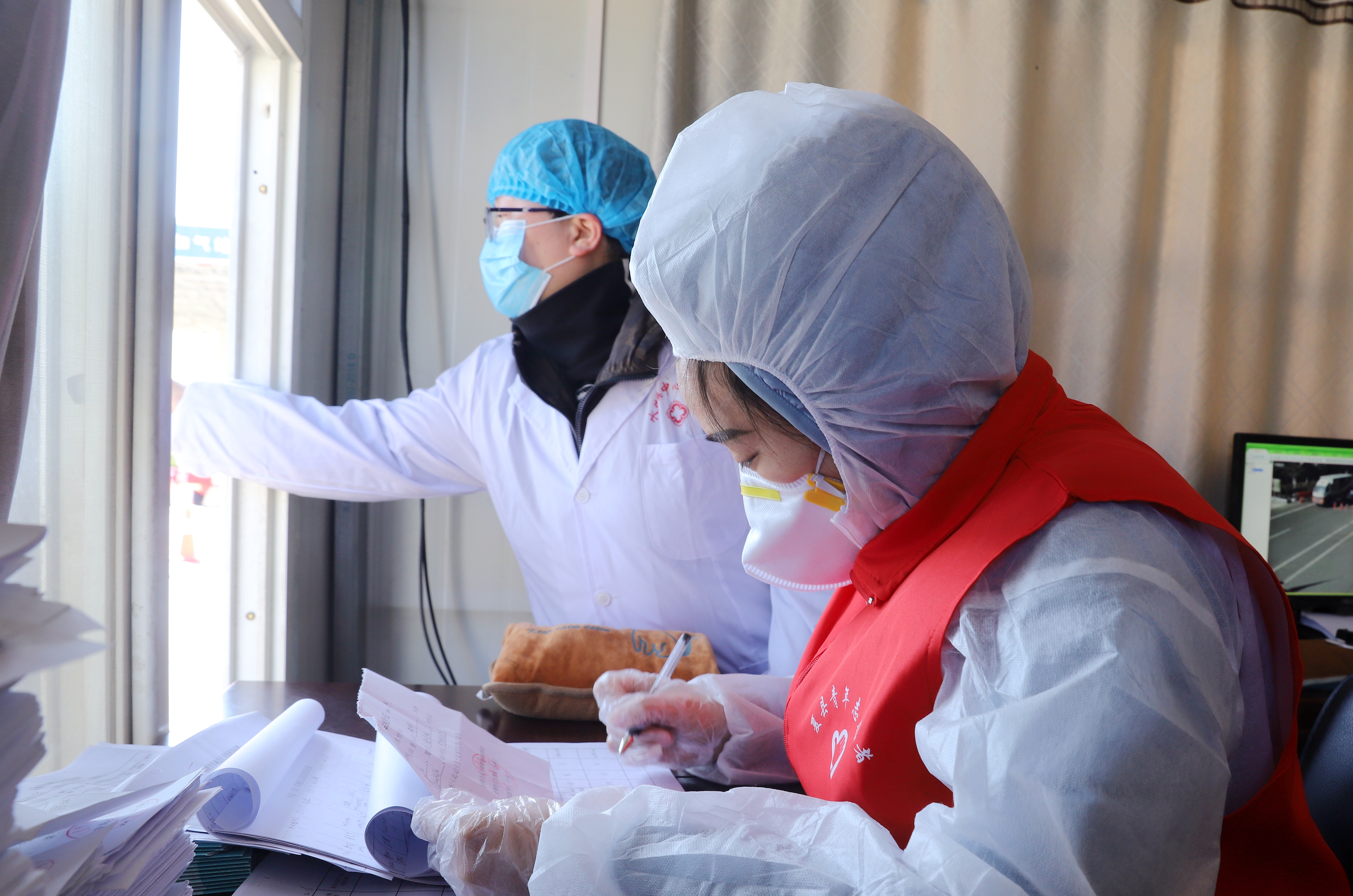 近日,在夏县北大门的水头高速路口疫情防控点,志愿者王洁汝(右)在协助进行疫情防控信息登记。