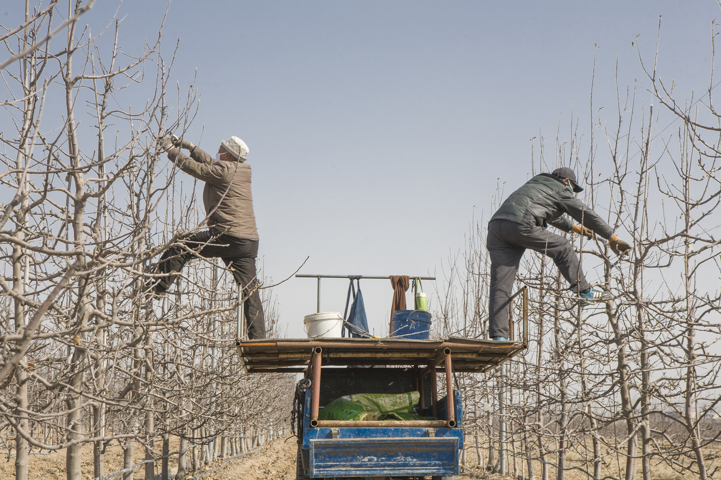 2月26日,芮城县果业中心的技术员在做好防疫的前提下,对该县西陌镇板桥村董铁龙家的果树进行修剪。 2020年,芮城县将果树树龄长、果树密植、产量低的果园纳入“沿山精品苹果示范园建设项目”。该县果业中心技术员和聘请的乡土间伐专业队,上门帮助果农进行隔株间伐,同时对果树进行科学修剪。董应赞 胡军荣