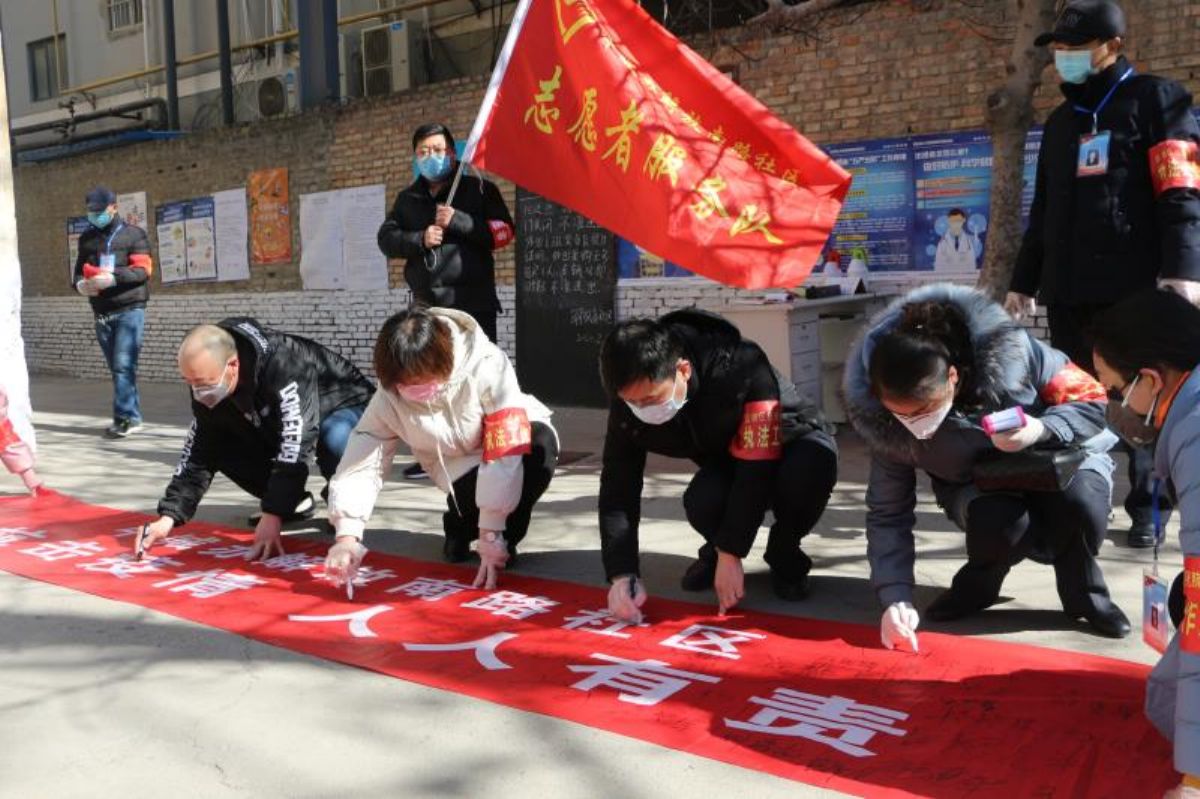 当前,疫情防控正处在最吃劲的关键阶段,为了鼓舞士气,继续抓紧防控工作,社区组织开展了"抗击疫情,人人有责"签名活动。社区主任韩芳与工作人员一行拿着条幅,先后到辖区15个小区、5条巷道的疫情防控一线,让值守的志愿者轮流签名,为他们鼓劲加油。